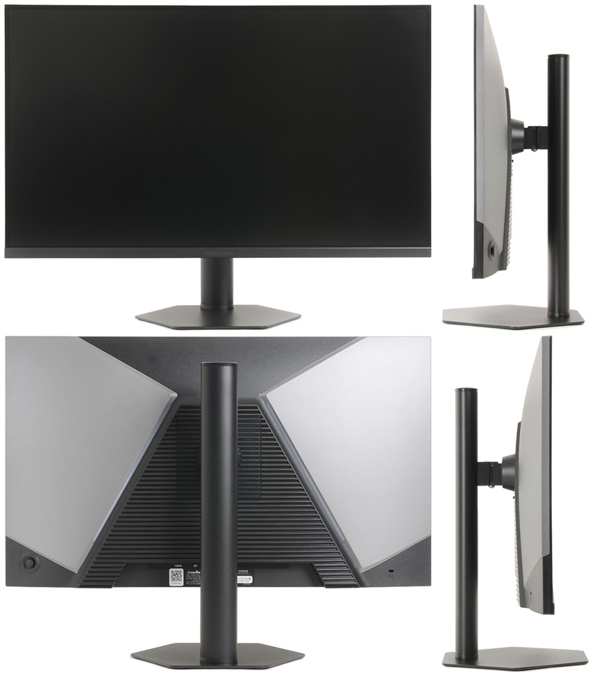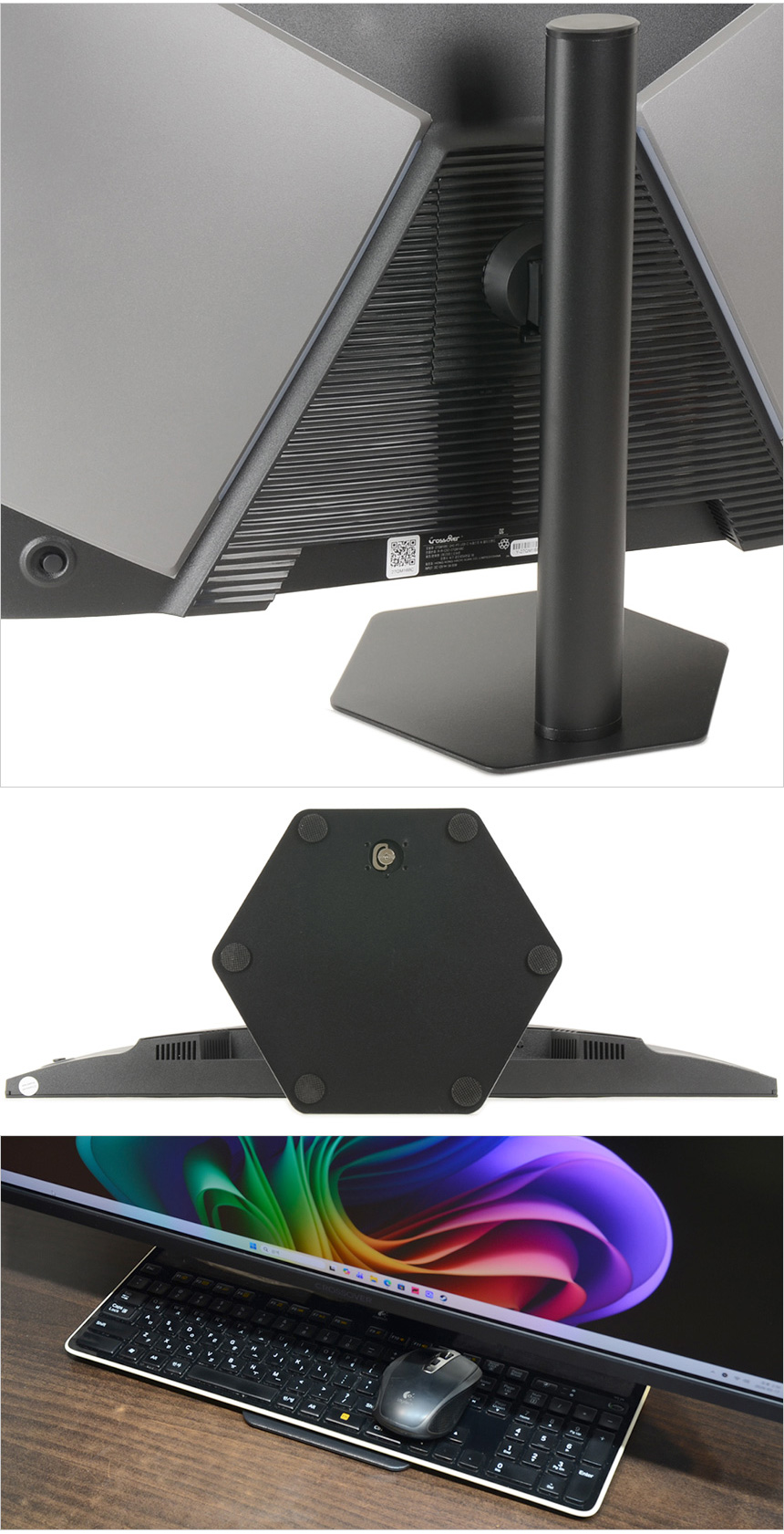 모니터 하단부의 모습으로 크로스오버 로고가 중앙에 세겨져 있으며 양 측면에는 3W 스피커가 장착되어 시원시원한 사운드를 즐길 수 있다. 이 제품은 도입부에서 언급한 것과 같이 티어링 현상을 방지하는 프리싱크 (어댑티브 싱크)를 지원하며 조준선, 5ms 응답속도 등을 지원해 원활한 게이밍이 가능하다.