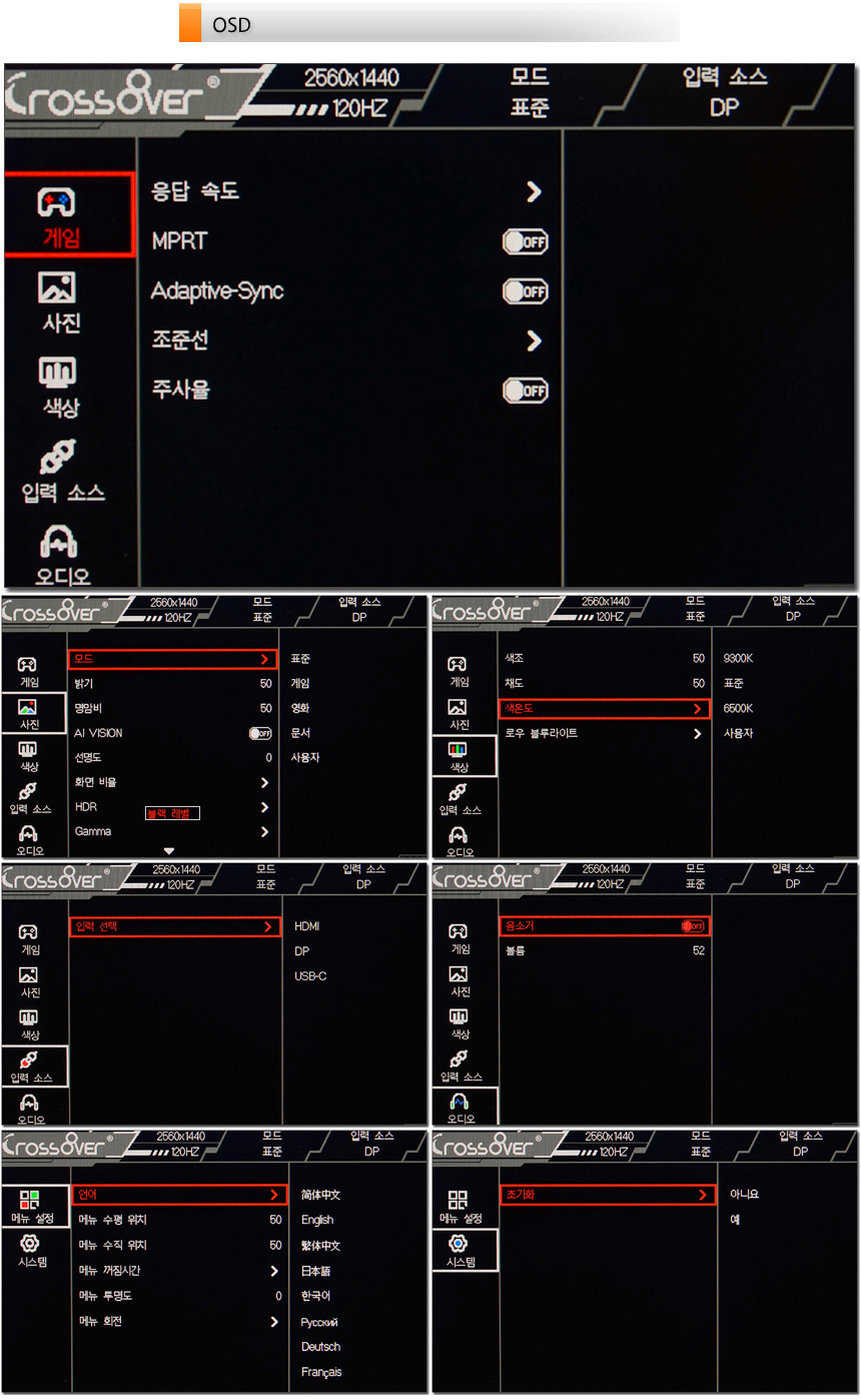 조그다이얼에서 버튼에서 핫키를 지원해 볼륨과 조준선, 입력소스 등 자주 사용하는 기능을 빠르게 설정할 수 있다. 메인메뉴 에서는 밝기나 명암 설정이 가능하며 게임관련 기능과 색상, 사운드 설정이 가능하다.