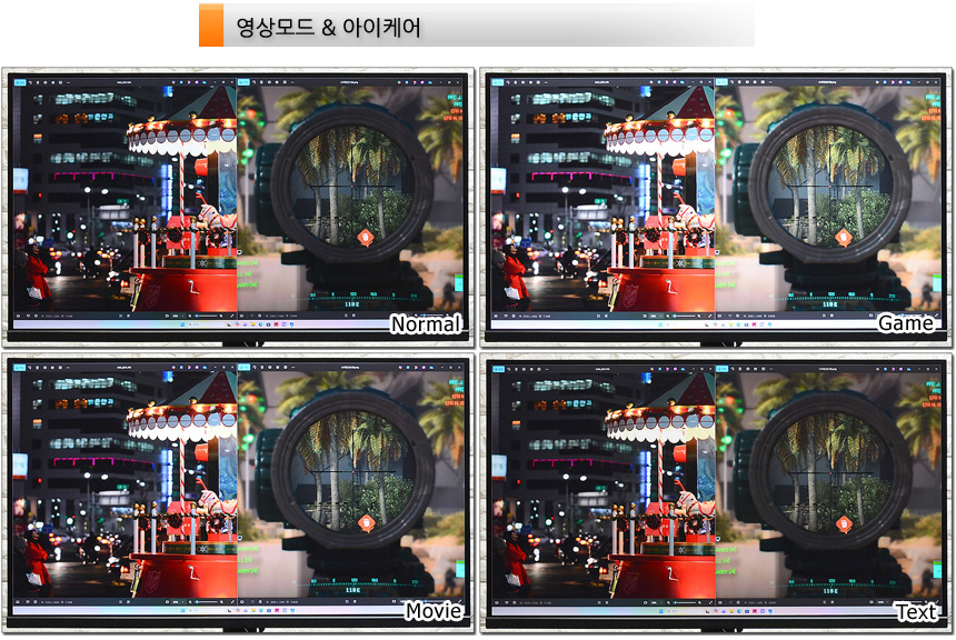 화면모드를 비교한 모습으로 밝기와 명암비에서 차이가 확연한 것을 확인할 수 있었다. 평소에서는 일반 모드를 사용하다가 (밝기 50%) 작업이나 게임을 할 경우 그에 맞는 모드로 변경해 최상의 영상을 즐기기 바란다.