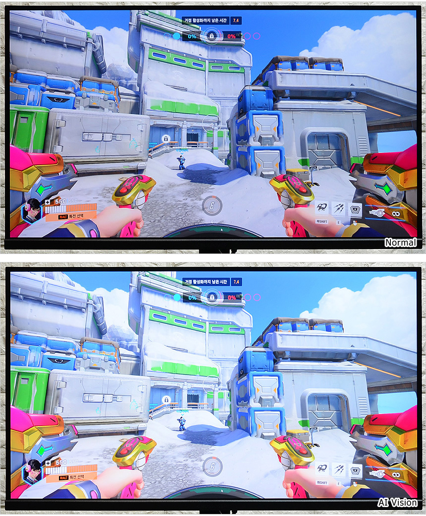 즐기는 컨텐츠에 맞게 최상의 영상을 제공하는 AI 비전 기술이 제공된다. 상단의 사진은 기본 상태와 비교한 모습으로 더 밝고 화사한 영상으로 변신한 것을 확인할 수 있다.