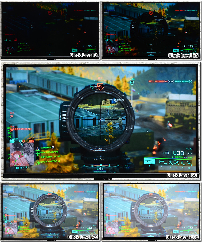 100단계 블랙레벨 설정을 지원한다. 적절한 블랙레벌 조정을 통해 게임에서 사용자가 원하는 최상의 영상을 즐길 수 있다. (무조건 블랙레벨을 높게 설정한다고 좋은게 아니다. 밝아지는 만큼 색감이 떨어지기 때문이다.)