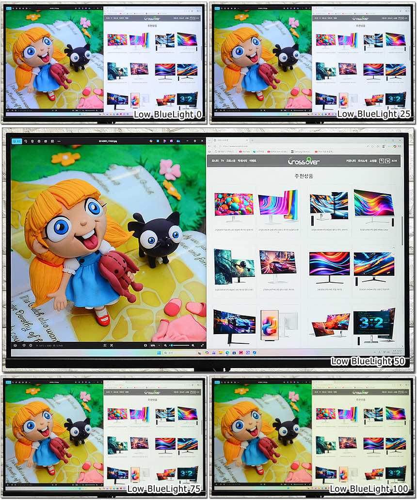 눈건강을 해치는 블루라이트 감소 기능을 제공한다. 상단의 사진은 단계별 영상의 모습으로 설정값에 따라 차이가 발생하는 것을 확인할 수 있다. (색의 왜곡이 있기 때문에 게임이나 멀티미디어 감상 보다는 흰색 배경에서 작업이 이루어지는 웹서핑이나 오피스 등에서 사용할때 큰 효과를 볼 수 있다.)