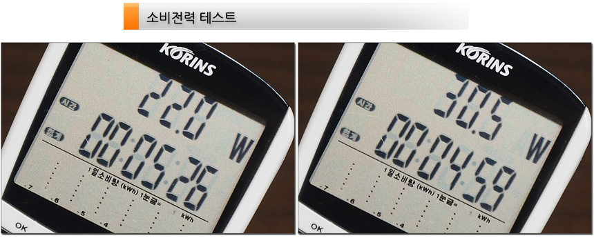 소비전력 테스트를 진행하고 있는 모습으로 50% 밝기에서 22W, 100% 밝기에서 30.5W 소비전력으로 작동했다. (일반적인 용도로 사용시 50% 밝기로도 충분했다. 전기세 걱정없이 사용할 수 있을 것이다.)