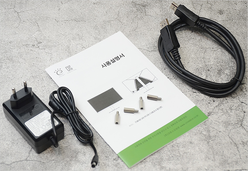 기본 제공되는 액세서리의 모습으로 케이블 일체형 전원 어댑터와 케이블을 비롯해 설명서와 DP 케이블이 포함되어 있다. 또한 베사홀 연장볼트도 지원한다.