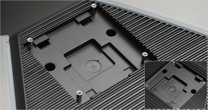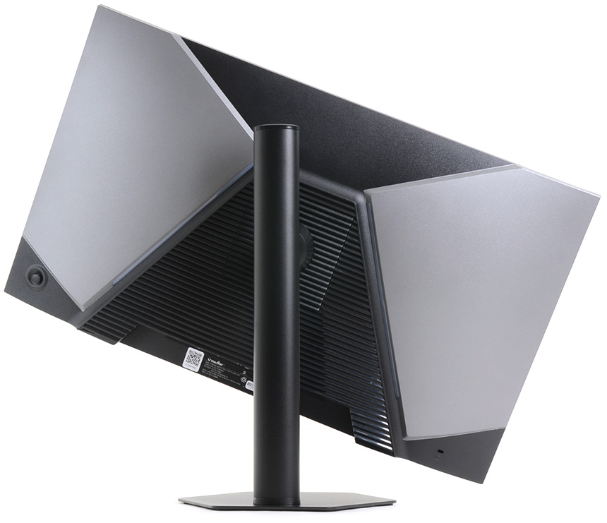 후면 중앙에는 100 x 100mm 의 베사홀이 설치되어 있어 벽에 걸거난 ARM 에 장착해 사용할 수 있고 (스탠드는 툴리스 방식을 지원해 손쉽게 탈부착 할 수 있다.) 하단에는 HDMI와 DP, C타입 단자를 지원해 PC나 노트북은 물론, 게임콘솔과 OTT 플레이어, 스마트폰 등 다양한 디바이스와 연결해 사용할 수 있다. 또한 헤드셋이나 이어폰 연결을 위한 오디오 Out 단자와 전원 단자를 지원한다.