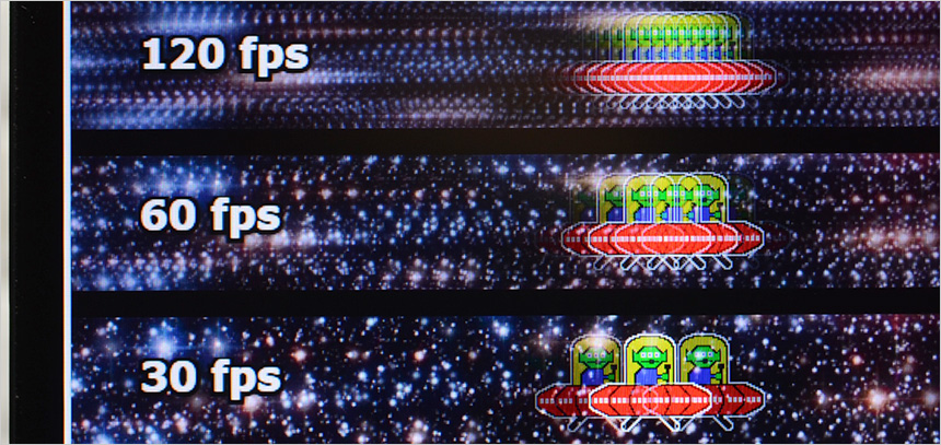 보급형 모니터와 달리 120Hz 주사율 지원으로 순간적인 움직임도 정확하게 파악하고 빠르게 대응할 수 있다. 상단의 사진은 240Hz 의 높은 주사율을 쉽게 확인할 수 있도록 하위 프레임과 같이 재생되는 영상 (960 Pixel Per Sec) 을 셔터스피드 1/20 로 촬영한 모습으로 프레임이 높아질수록 시간당 많은 화면이 뿌려지기 때문에 캐릭터의 수가 많은 것을 확인할 수 있다. 직접 눈으로 영상을 볼 경우 120Hz 가 훨씬 자연스럽게 움직인다.