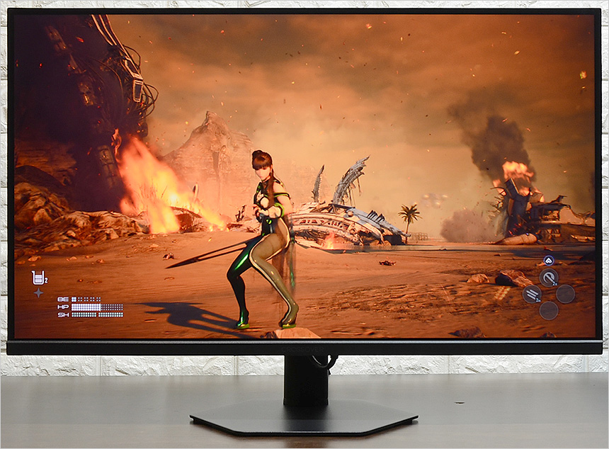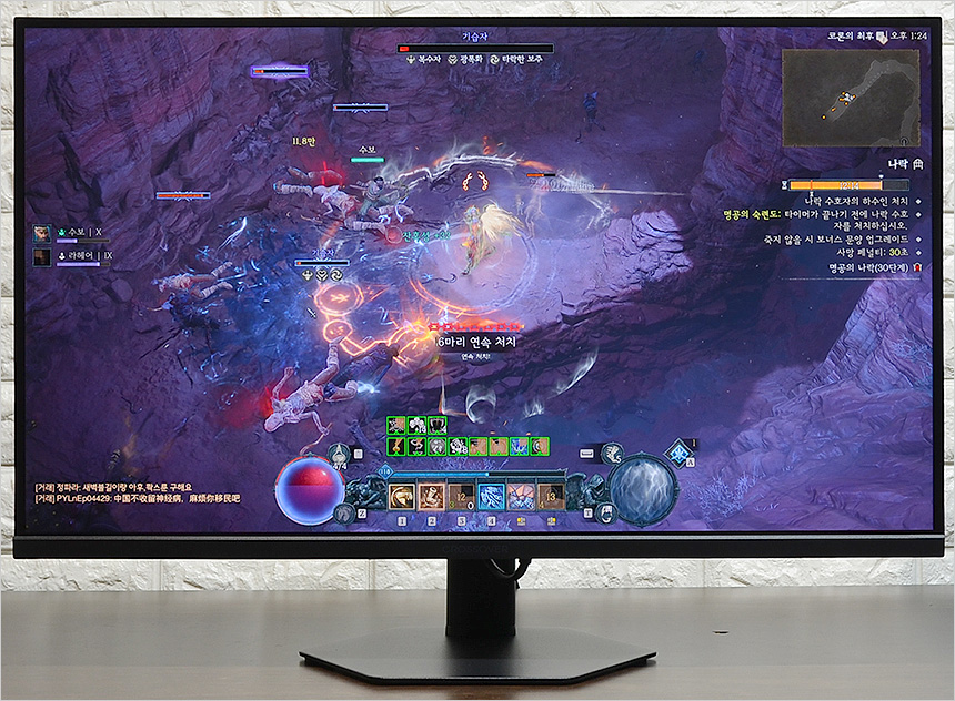 디아블로 4 와 스텔라 블레이드를 테스트 하고 있는 모습으로  IPS 특유의 선명한 색감이 돋보였으며 두게임 모두 배경이 어두운 편이지만 높은 밝기를 지원할 뿐만 아니라 블랙레벨 설정이 가능해 캐릭터와 배경을 구분하는데 문제가 전혀 없었다. (집에서 디아블로 4를 플레이 하다보면 나락등에서 어두운 곳이 검게 뭉개져 답답함을 느낄때가 많다.)