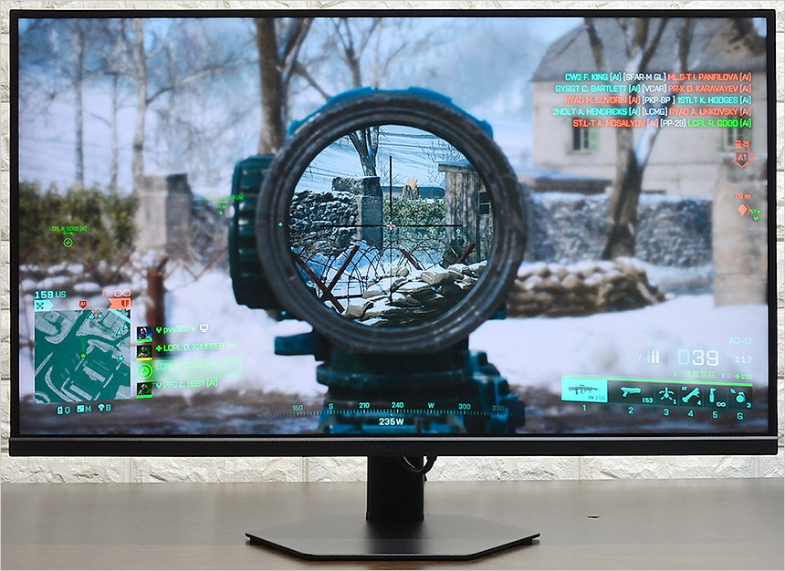 컬러가 변하지 않는 일반 조준선과 달리 배경 컬러에 따라 조준선 컬러가 달라져 시인성을 개선하는 AI 조준선 지원으로 사격 정확성을 높일 수 있었으며 모드를 게임으로 변경시 밝기가 높아져 암부의 정확한 구분이 가능했다. 최근 출시되는 200Hz 이상의 게이밍 모니터에 비할 수준은 아니지만 게이밍 용도로도 충분히 활용할 수 있는 모델이다.