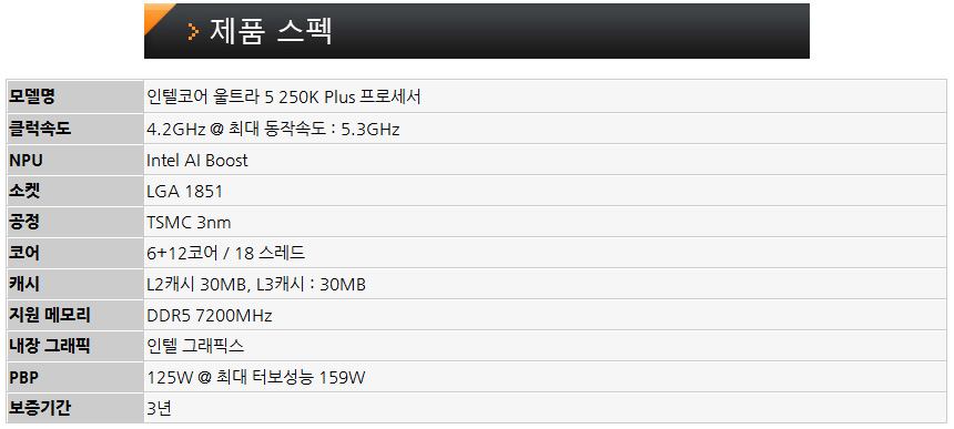 인텔코어 울트라5 250S Plus 는 내장그래픽을 지원하는 250K Plus 뿐만 아니라 외장그래픽 사용자를 위한 250KF Plus 모델도 출시한다. (당연히 내장그래픽이 빠진 265KF 가 더 저렴할 것으로 예상된다.) 라이프 스타일을 고려해 CPU를 선택하기 바란다.
