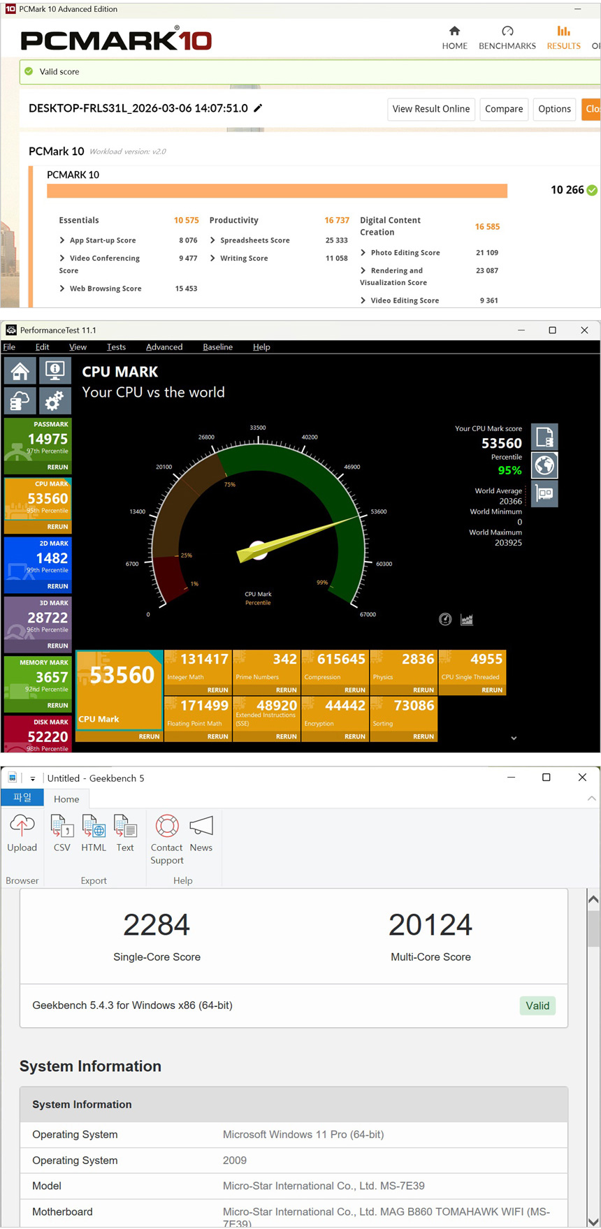 PC의 전반적인 성능을 나타내는 PCMARK10 의 경우 9321에서 10266 으로 높아졌으며 패스마크 CPU 마크는 44082에서 53560 으로 으로 상당히 상승했음을 알 수 있었다. 또한 긱벤치 5를 실행했을 때 18440 이 20124로 높아졌다.