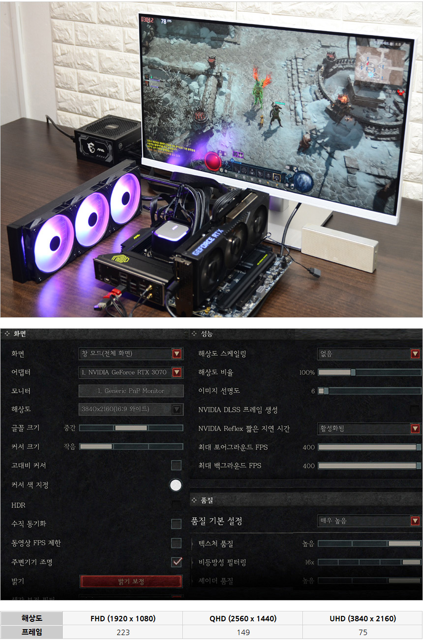 디아블로 4를 이용해 프레임 테스트를 진행한 모습으로 (매우높음 옵션, 업스케일링 사용안함) 프레임이 상당히 높은 것을 확인할 수 있었다. 최신 그래픽카드를 사용하고 DLSS나 FSR을 적극 활용하면 더 쾌적하게 최신 게임을 즐길 수 있다.