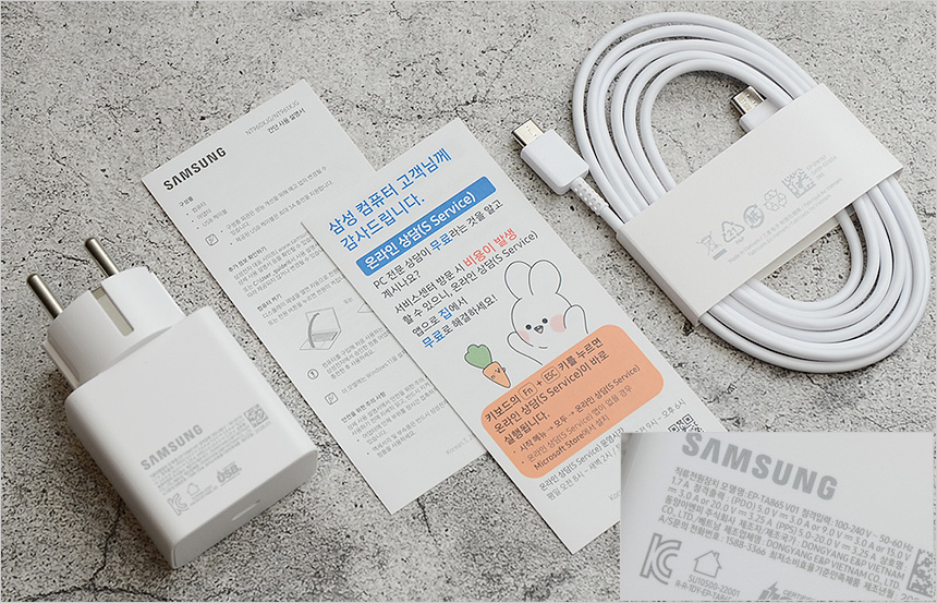 풀킷의 모습으로 노트북을 비롯해 작은 크기로 편하게 휴대할 수 있는 65W 전원 어댑터와 C타입 케이블이 제공되며 퀵 매뉴얼이 포함된 것을 확인할 수 있다.