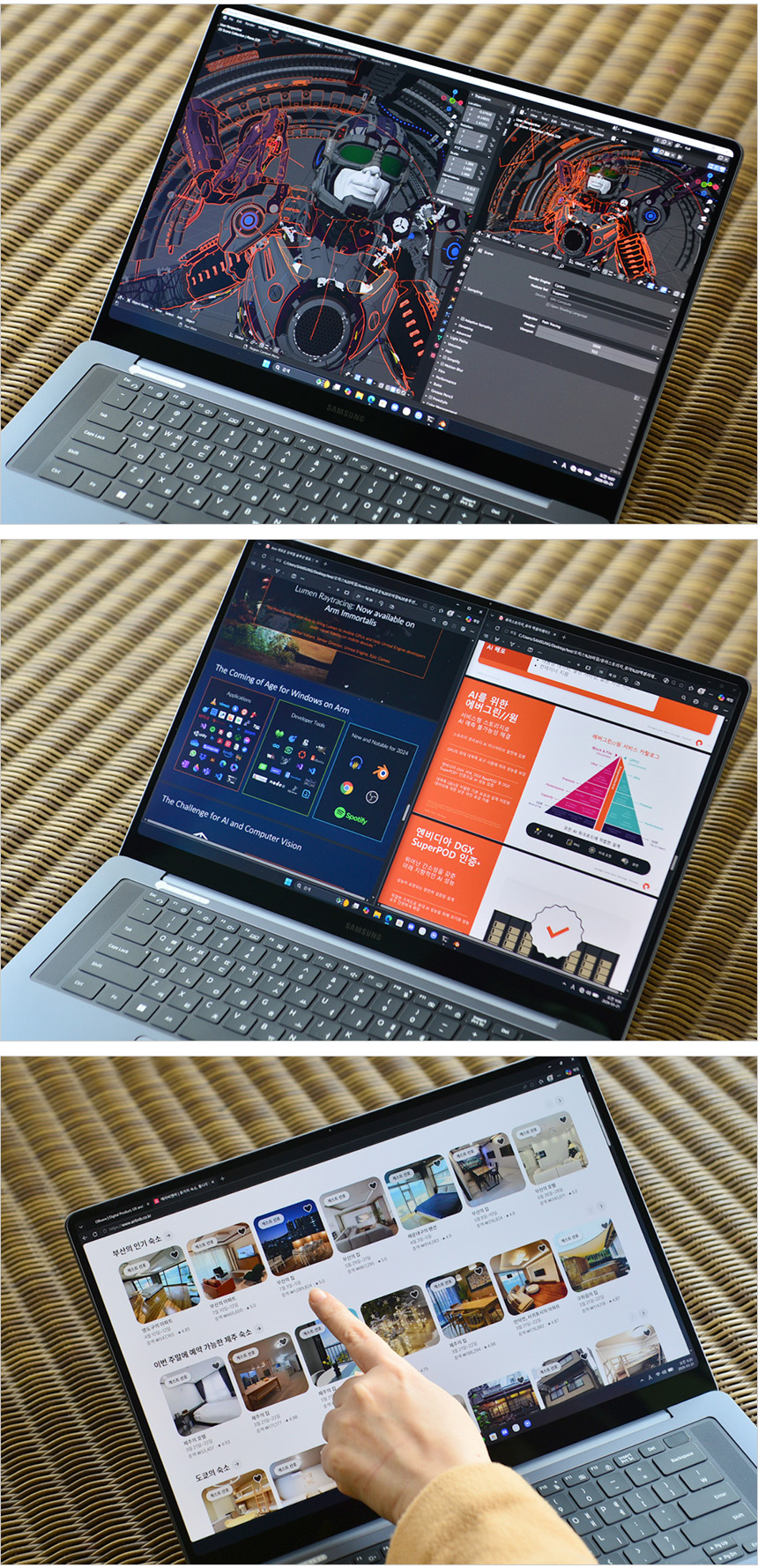 보급형 노트북을 압도하는 디테일과 뛰어난 화질도 장점이라 할 수 있다. Dynamic AMOLED 2X 디스플레이를 탑재해 진한 색감을 즐길 수 있었으며 블루라이트 감소 기술, 저반사 패널, 120Hz 주사율로 장시간 사용시에도 눈이 상당히 편했다. 뿐만 아니라 터치를 지원해 편하게 노트북을 조작할 수 있었으며 HDR 1000nits로 밝기가 높아져 더 사실감 넘치는 영상을 즐길 수 있었다.