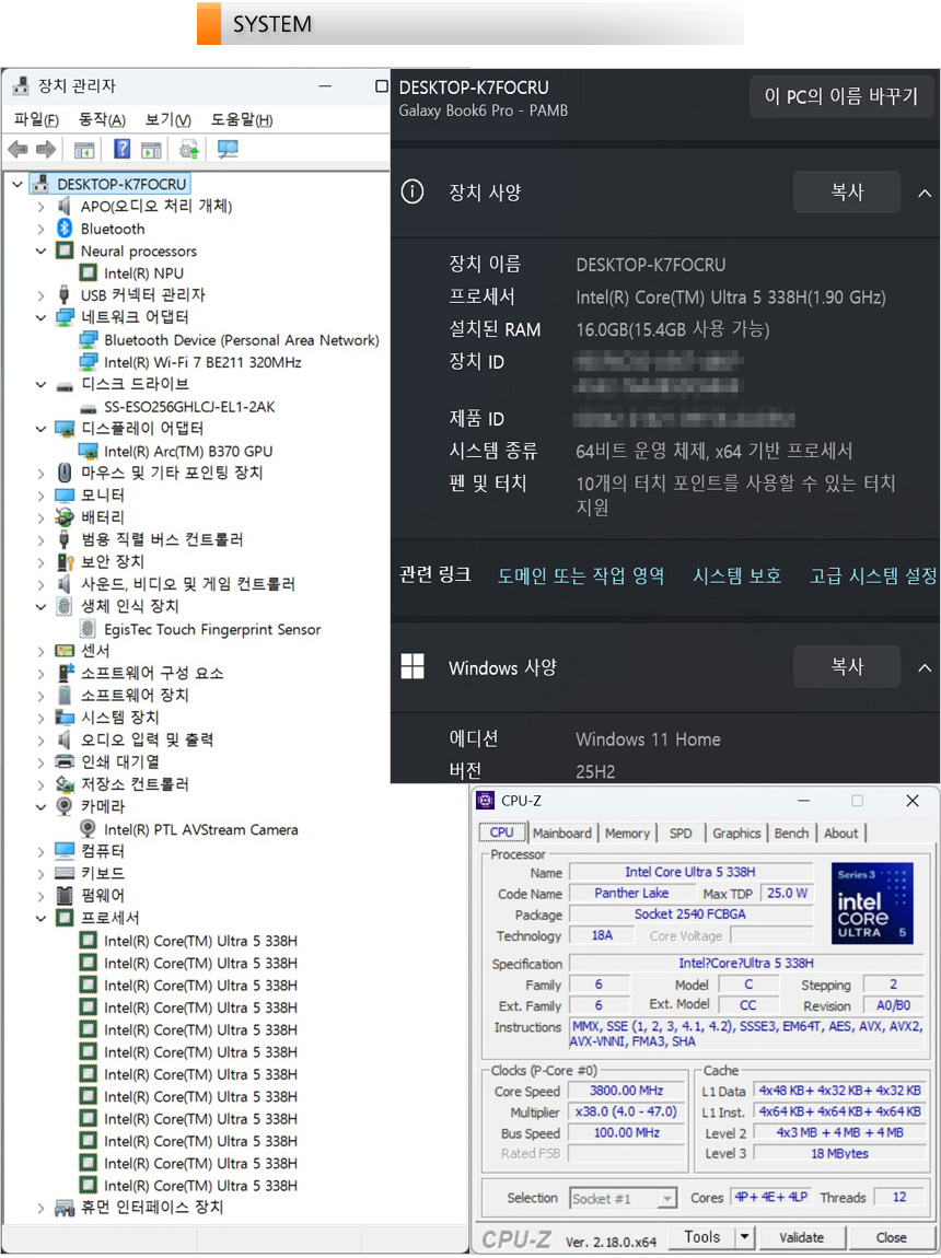 장치관리자와 CPU-Z 등을 통해 시스템 정보를 확인하고 있는 모습으로 4P+4E+4LP 코어에 20MB+18MB 캐시를 지원하는 인텔코어 울트라 5 338H 프로세서가 탑재된 것을 확인할 수 있다. 도입부에서 언급한 것과 같이 인텔 아크 B370 내장그래픽이 적용된 것을 확인할 수 있으며 16GB 메모리를 지원해 고성능을 필요로 하는 작업도 부드럽게 실행할 수 있다.