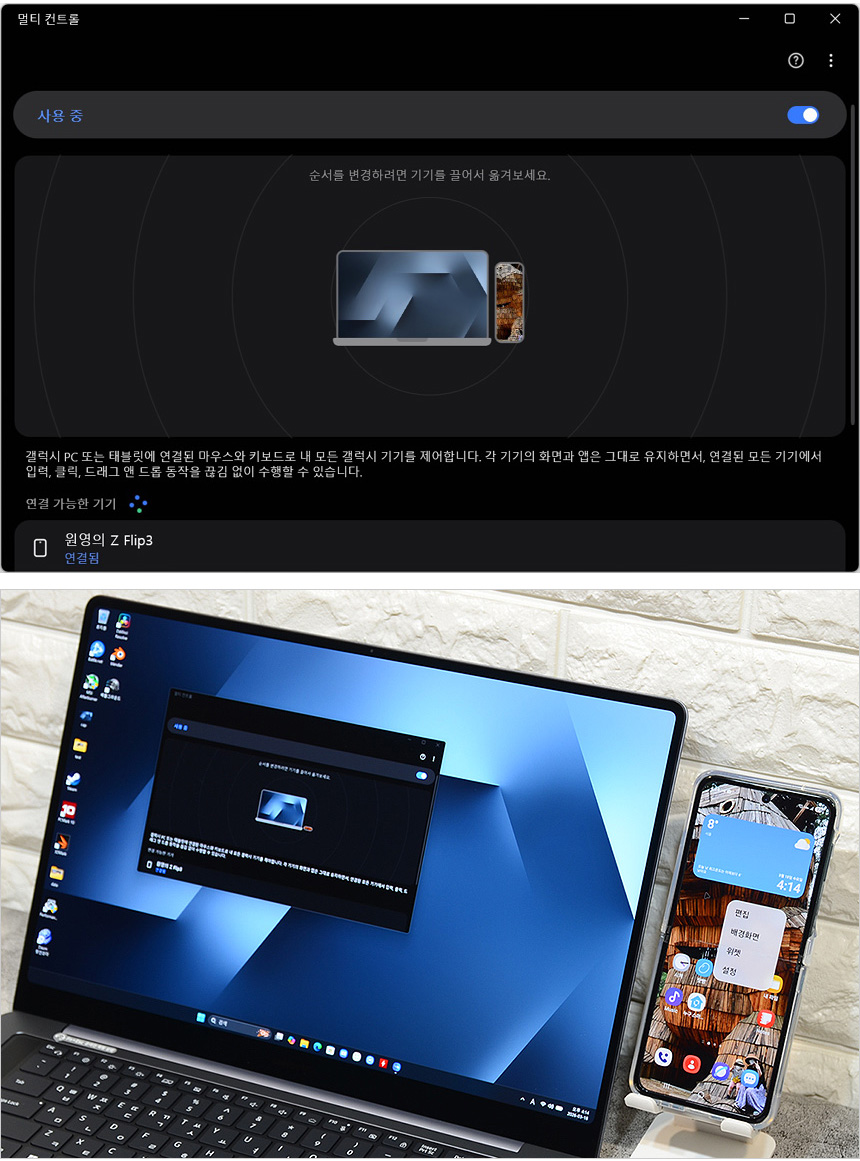 키보드와 마우스를 스마트폰에서도 사용할 수 있는 멀티 컨트롤을 지원한다. 상단의 사진은 멀티 컨트롤을 테스트 하고 있는 모습으로 듀얼 모니터를 사용한 듯 자연스럽게 마우스 커서가 이동하는 것을 확인할 수 있었다. 텍스트 등을 복사에 기기간 붙여넣기도 할 수 있어 유용하게 활용할 수 있을 것이다. @ 동영상을 확인하기 바란다.