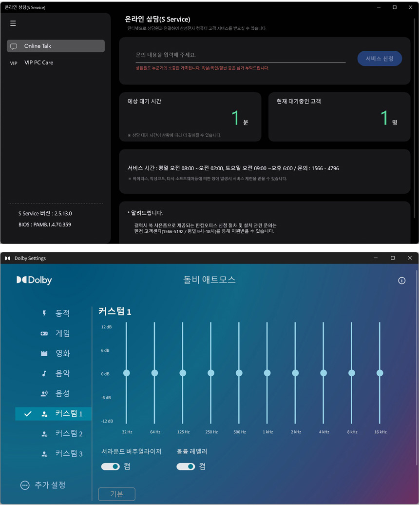 노트북에 문제가 생겼을 때 온라인 상담을 통해 손쉽게 문제를 해결할 수 있으며 돌비 애트모스 지원으로 사용자에 맞는 최적의 음색을 설정할 수 있다.
