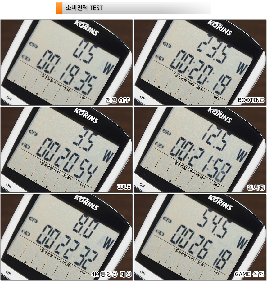 소비전력 테스트를 진행하고 있는 모습으로 (밝기 50%, 최고성능 모드) 캐주얼한 작업에서는 25W 미만의 낮은 소비전력으로 작동했으며 높은 성능을 필요로 하는 게임에서는 50W 이상으로 소비전력이 올라가는 것을 확인할 수 있었다. (고성능으로 셋팅하면 최대성능을 구현하기 위해 소비전력을 높인다. 이점 참조 바란다.)
