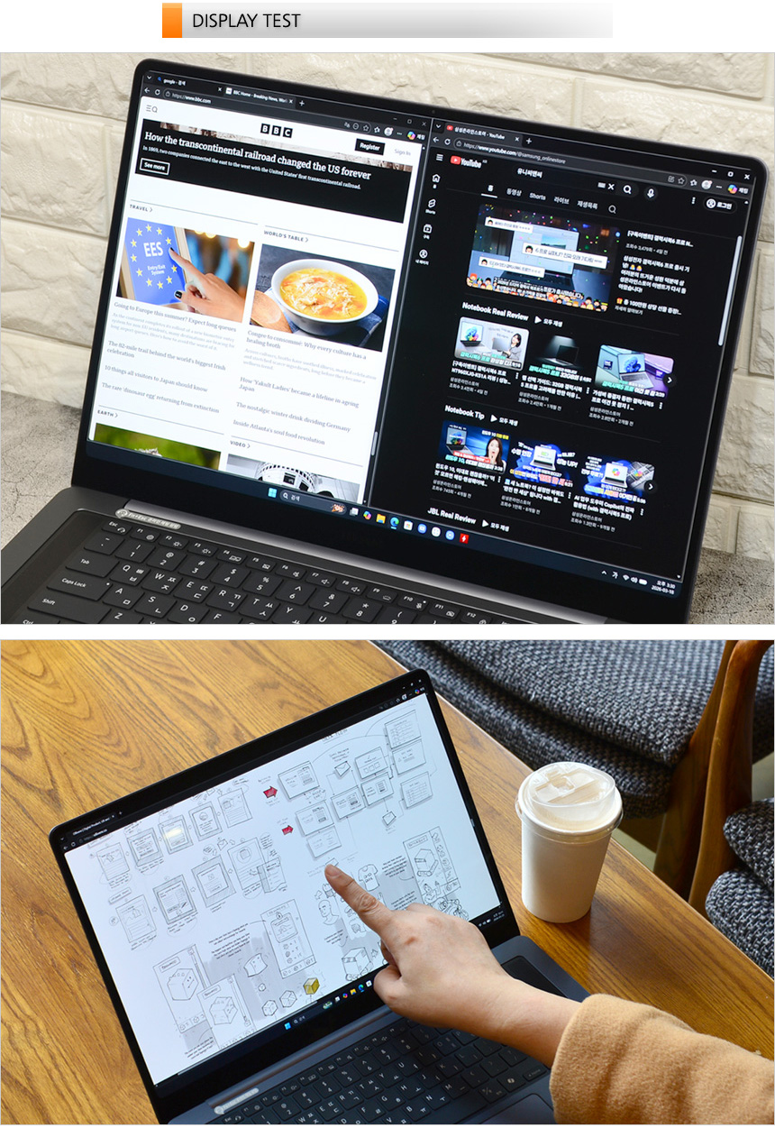 이 제품은 16형 대화면에 WQXGA+ 고해상도를 지원해 2개 이상의 창을 여유롭게 띄어두고 사용할 수 있다. 특히 세로의 길이가 긴 16:10 비율이 적용되어 인터넷이나 문서 등의 글을 편하게 읽을 수 있었다. 또한 터치인식 테스트을 진행하고 있는 모습으로 핑거 터치 임에도 정확하게 동작하는 것을 확인할 수 있었다. (동영상을 확인하기 바란다.) 어디서나 편하게 노트북을 조작할 수 있다.
