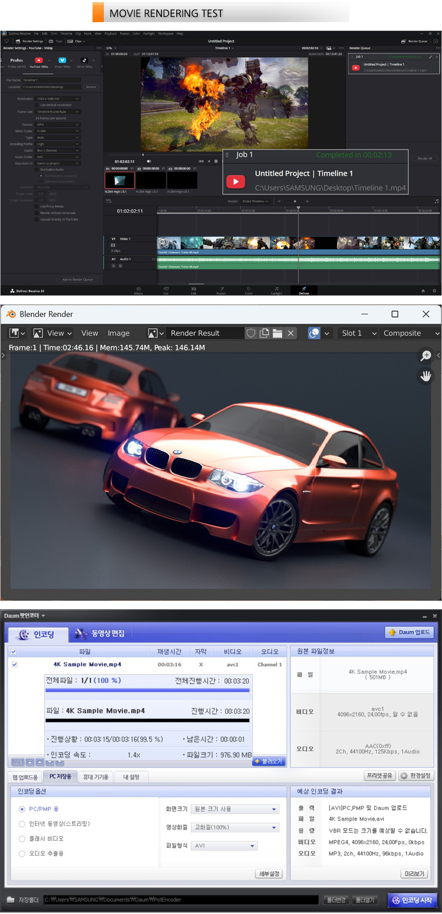 영상편집 S/W 다빈치 리졸브를 이용해 랜더링 테스트를 진행하고 있는 모습으로 (640MB, 920MB, 990MB 4K 동영상을 단일 동영상으로 랜더링, FHD 해상도에 H.264 비디오 코덱) 2분 13초가 소요되는 것을 확인할 수 있었으며 블랜더 랜더링 테스트에서는 2분대의 빠른 랜더링 시간을 보여주었다. 또한 다음 팟인코더를 이용해 4K 동영상의 인코딩을 진행했는데 3분 20초의 인코딩 시간을 보여주었다. @ 참고로 영상편집 테스트의 경우 얼마전 리뷰했던 NT960XJG-K52A 와 1개의 테스트 영상이 다르다. 이점 참조 바란다.