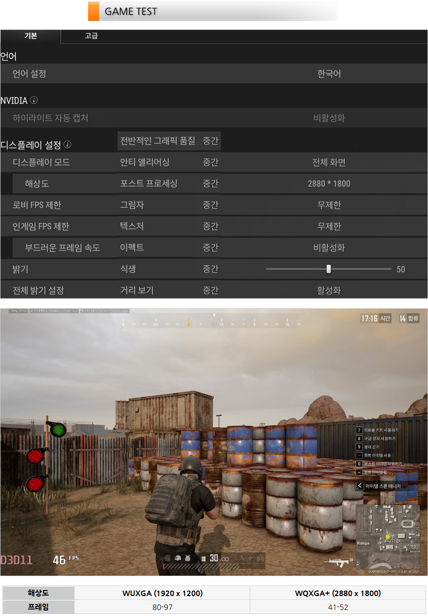 업스케일링을 지원하지 않는 배틀그라운드 (연습장)를 실행한 모습으로 WQXGA+ 해상도에서는 원활하게 실행되기는 하지만 약간 벅찬 모습을 보여주었다. 하지만 WUXGA 해상도에서는 프레임이 상당히 높아 원활하게 게임을 즐길 수 있었다.