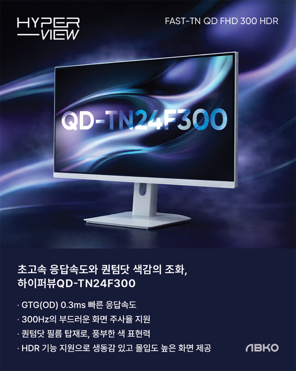 앱코에서 기존 TN 패널의 한계를 넘어선 Fast TN 기술을 기반으로 빠른 응답속도에 더해 퀀텀닷 필름을 탑재, TN 패널의 최대 단점인 색감 요소 또한 개선하여 게이머와 콘텐츠 소비자 모두를 만족시키는 성능을 구현한 ‘하이퍼뷰 QD-TN24F300’ 모니터를 선보였다. 특히 GTG(OD) 기준 0.3ms의 초고속 응답속도를 지원 부분은, 화면 전환이 빠른 FPS 게임이나 액션 장르에서도 잔상 없이 또렷한 화면을 제공한다. 이는 빠른 판단과 정확한 컨트롤이 중요한 환경에서 확실한 경쟁력을 제공하는 요소다.