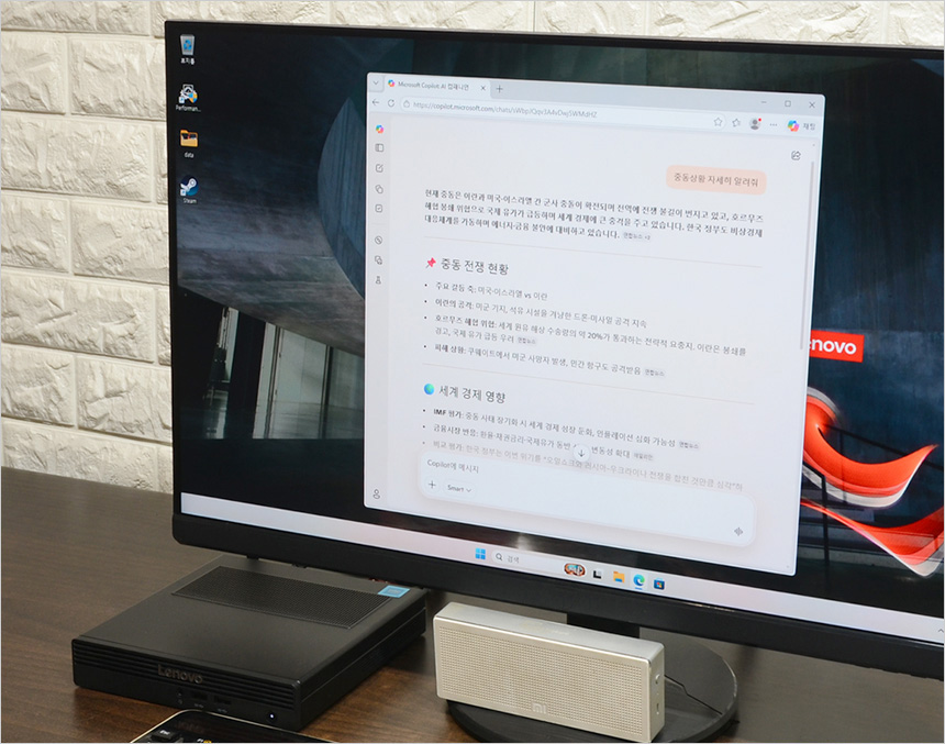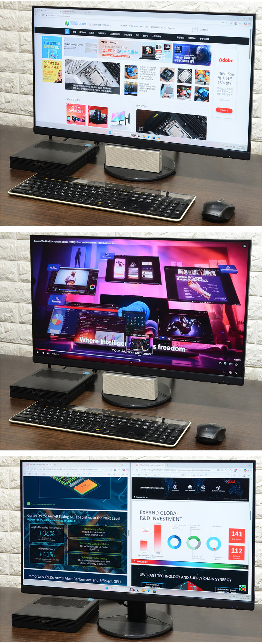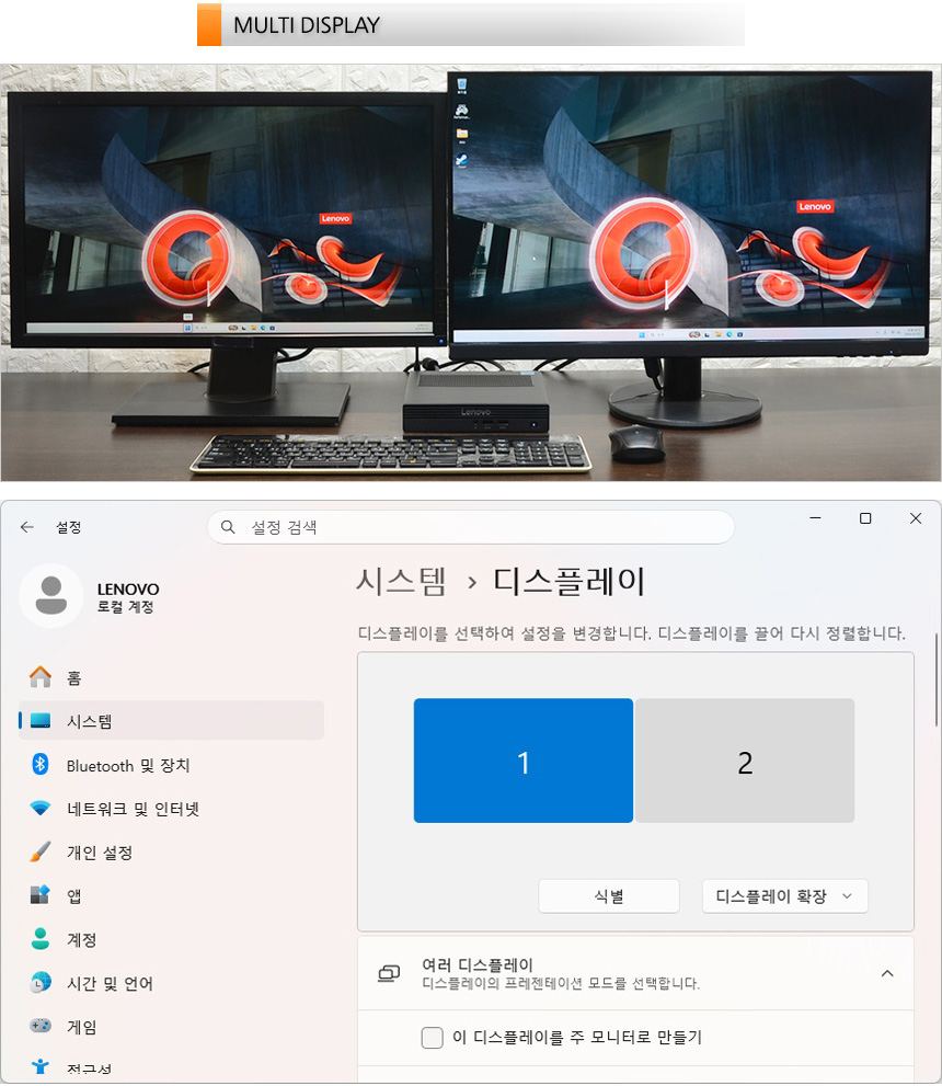 HDMI와 DP 단자를 지원해 2개의 모니터를 연결해 사용할 수 있으며 확장슬롯에 VGA 장치를 추가로 장착하면 3개의 모니터 연결이 가능하다. 상단의 사진은 멀티 디스플레이 테스트를 진행하고 있는 모습으로 원활하게 작동하는 것을 확인할 수 있었다. (고성능 PC가 아니기 때문에 QHD나 4K 모니터 보다는 FHD 해상도의 모니터를 연결해 사용하기 바란다.)