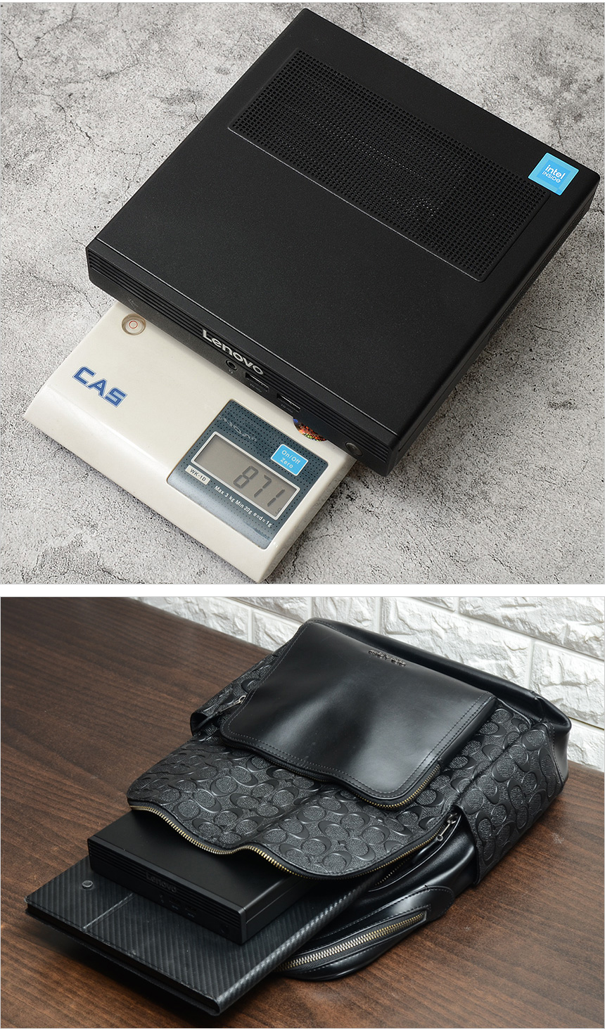 크기는 작지만 1Kg 이상으로 상당히 무거운 일반 미니PC와 달리 1Kg 미만의 가벼운 무게로 다양한 장소에서 사용해야 하는 유저들이 편하게 들고 다니며 사용할 수 있다. (다양한 장소에서 업무를 봐야하는 하이브리드 업무 환경이나 모니터와 키보드/마우스가 기본 셋팅된 공유 오피스 등에서 특히 편하게 사용할 수 있다.) 특히 크기가 상당히 작아 일반 서류가방에도 편하게 넣고 다닐 수 있다.