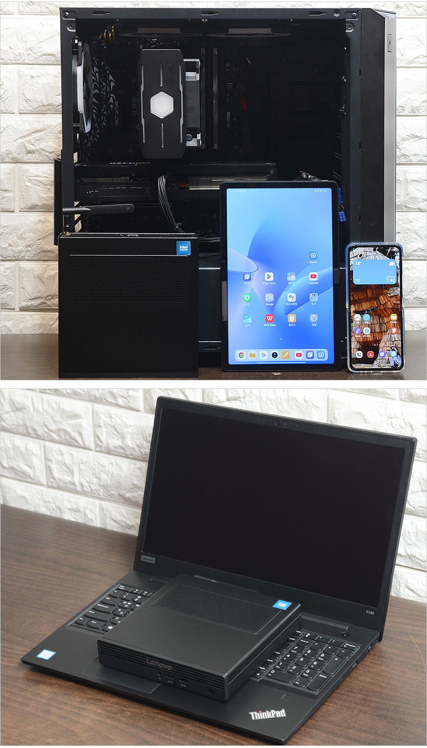 일반 데스크탑PC, 노트북, 태블릿PC, 스마트폰 등과 크기를 비교한 모습으로 상당히 작은 제품이라는 것을 바로 확인할 수 있었다. (공간 활용성에 특화된 PC를 찾고 있다면 더할나위 없는 선택이 될 것이다.)