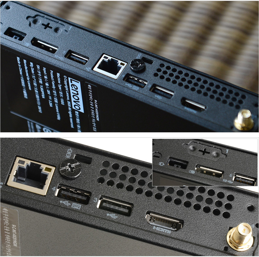 후면부의 모습으로 DP와 HDMI 단자를 지원해 2개의 모니터 연결이 가능하며 (옵션포트에 VGA 단자를 추가로 장착하면 3개의 모니터 연결이 가능하다.) 도난 방지를 위한 시큐리티 홀과 무선랜 안테나, 전원단자가 설치되어 있다. 또한 빠른 데이터 전송을 위한 USB 3.2 Gen2 단자를 비롯해 주변기기 연결을 위한 2개의 USB 2.0 단자를 제공하며 유선랜 사용을 위한 이더넷 단자도 설치되어 있다. (참고로 이 제품은 원격으로 컴퓨터를 켤수 있는 WOL 기능을 지원한다.)