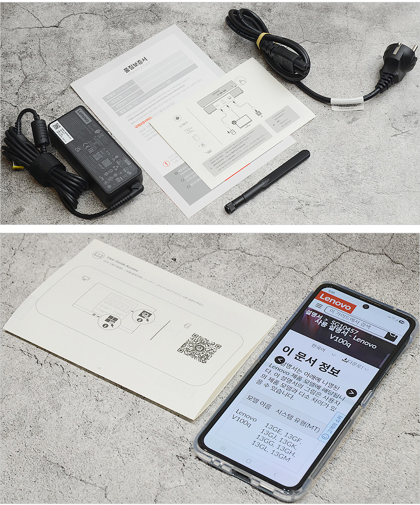 액세서리의 모습으로 전원 어댑터와 전원 케이블, 무선랜 안테나가 포함되어 있고 퀵 매뉴얼과 보증서를 제공한다. (QR코드를 스캔하면 사용설명서를 다운로드 받을 수 있다.) @ 참고로 이 제품은 1년 보증에 전문 상담원이 대기하며 출장방문이나 택배 접수가 가능한 프리미어 서포트를 지원한다.)