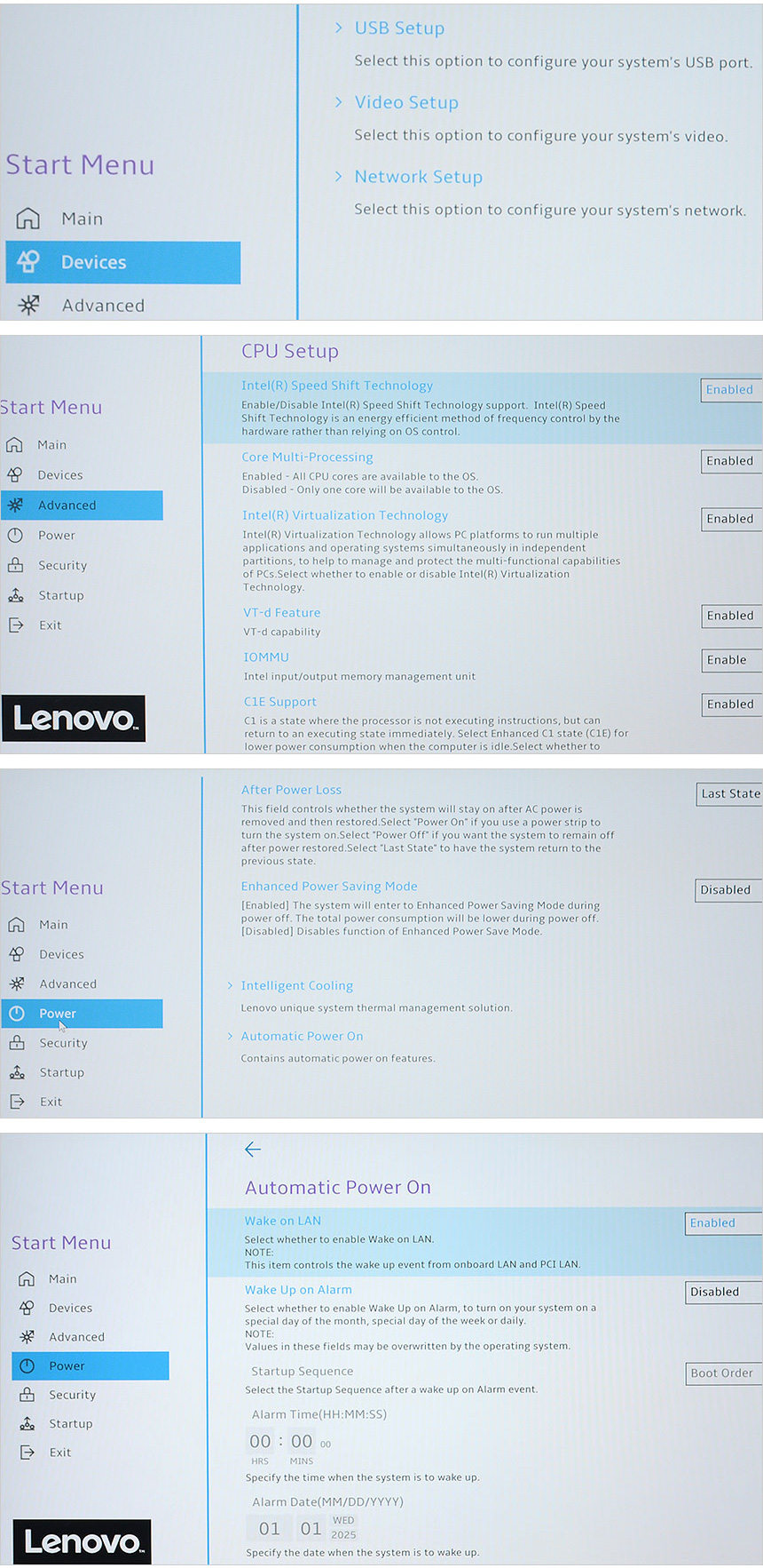 바이오스에 진입한 모습으로 시스템 정보 확인이 가능하며 USB와 비디오, 네트워크 설정이 가능하다. 또한 CPU의 디테일한 설정을 제공하고 상단에서 언급한 것과 같이 Wake on LAN 설정이 제공되는 것을 확인할 수 있다.