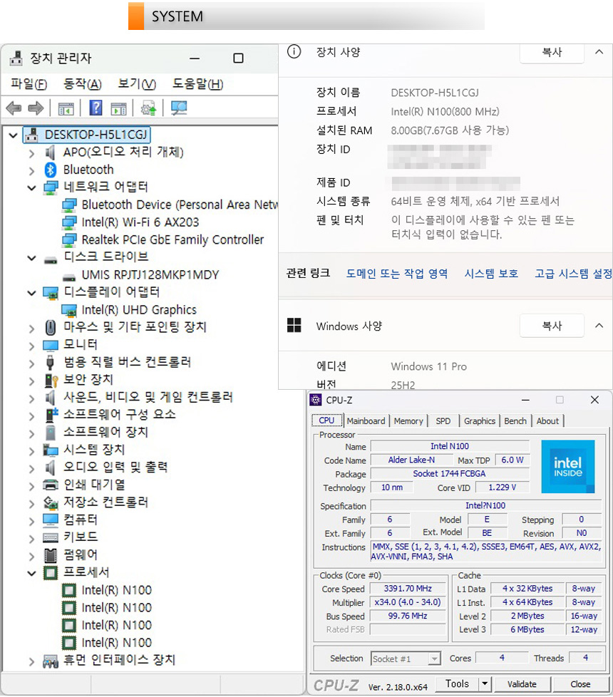 시스템 정보를 확인하고 있는 모습으로 인텔코어 N100 프로세서가 장착된 것을 확인할 수 있다. 4 코어 2+6MB 캐시를 지원해 고성능을 기대할 수는 없지만 캐주얼한 작업은 부드럽게 실행할 수 있다. 또한 8GB DDR5 메모리와 128GB NVMe SSD가 장착되어 빠른속도를 체감할 수 있다. 여기에 인텔 Wi-Fi 6 무선랜카드를 지원해 빠른 무선속도를 즐길 수 있다.