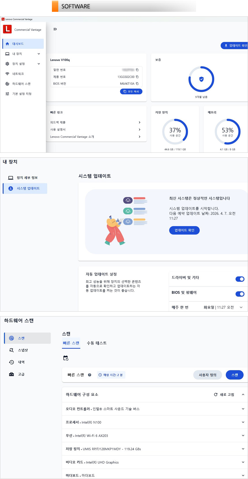 전용 S/W 레노버 Vantage 프로그램이 기본 설치되어 있다. (프로도스 모델은 MS 스토어에서 다운로드 받을 수 있다.) 시스템 업데이트를 지원해 최상의 컨디션을 유지할 수 있으며 스캔을 통해 문제를 빠르게 파악할 수 있다.