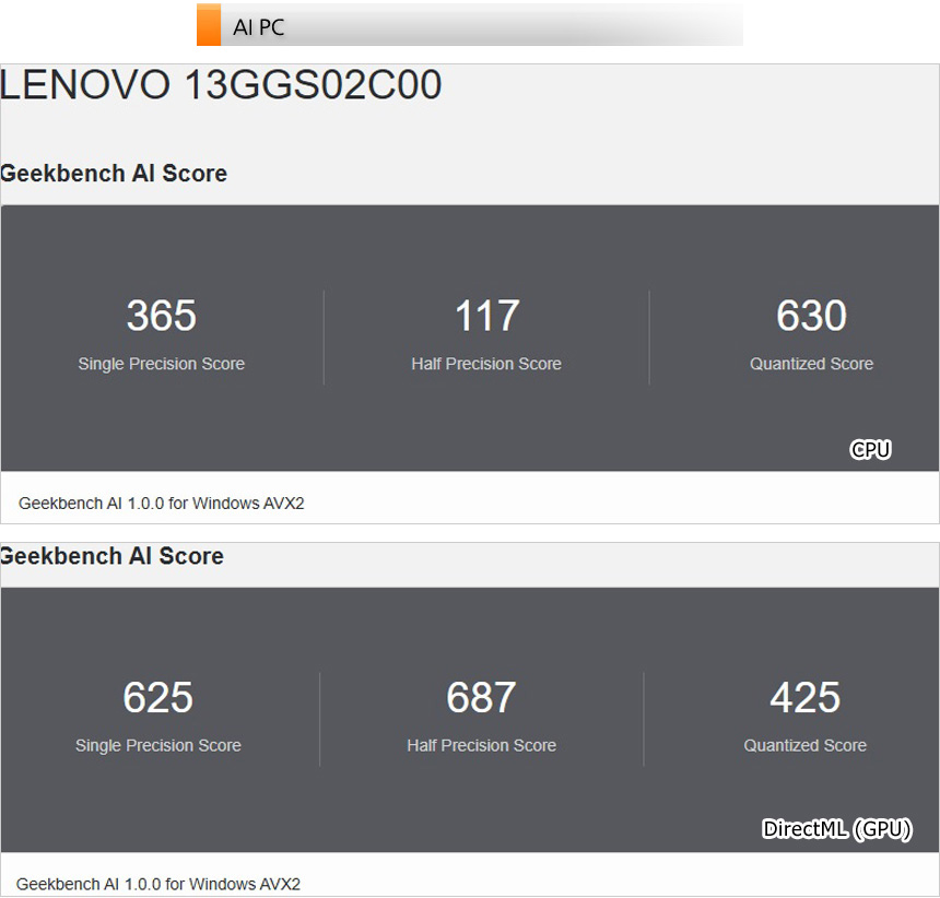 AI 전용 벤치마크 툴을 이용해 AI 성능 테스트를 진행하고 있는 모습으로 고성능 PC와는 스코어 차가 크다. 하지만 코파일럿 등은 충분히 사용 가능하다.