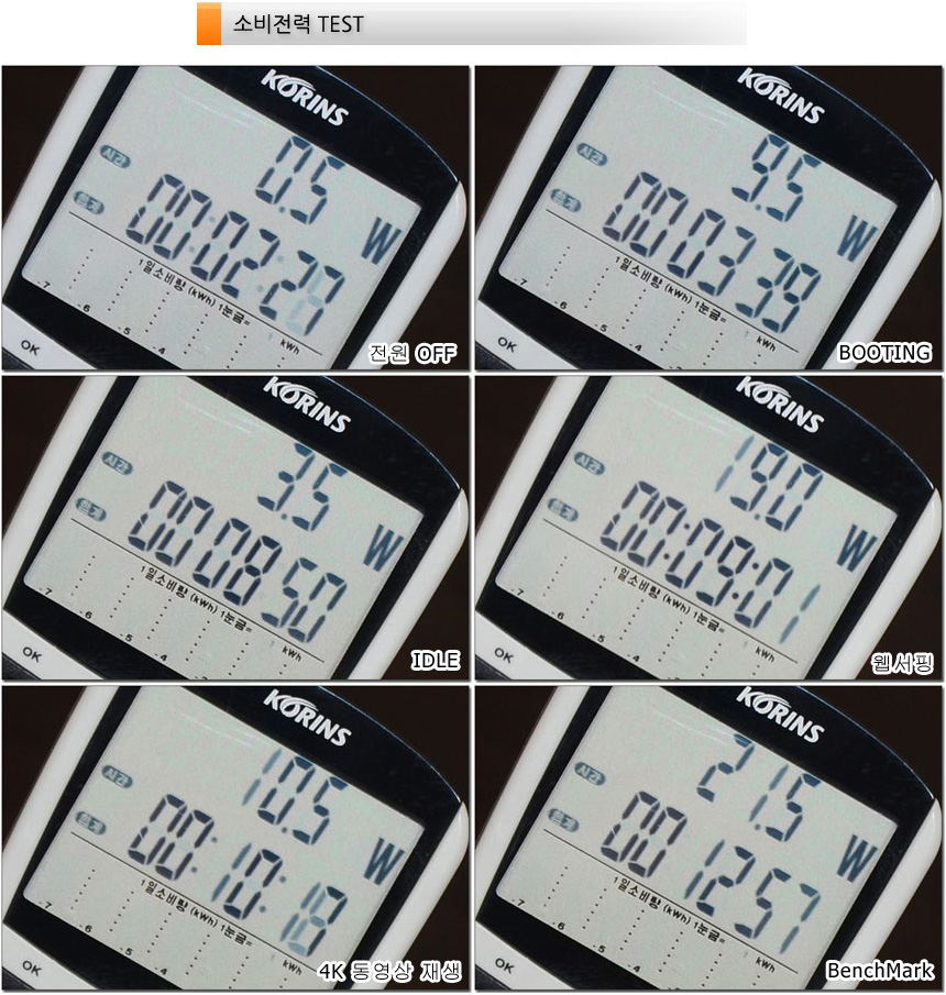소비전력 테스트를 진행하고 있는 모습으로 컨텐츠별 차이가 큰 일반PC와 달리 큰 차이가 발생하지 않는 것을 확인할 수 있었다. 최대 20W 정도로 구동되어 전기세 걱정없이 사용할 수 있을 것이다.