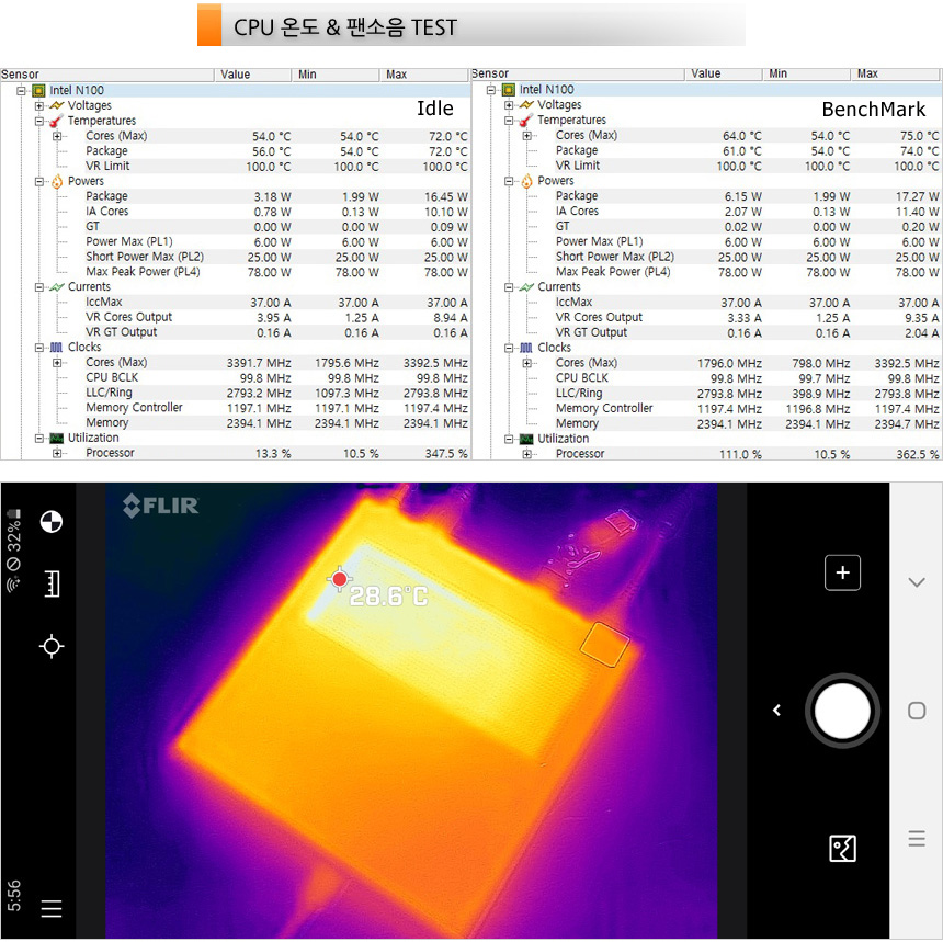 CPU 온도 테스트를 진행하고 있는 모습으로 (실내온도 14도) 아무것도 하지 않은 Idle 상태에서는 50도 중반으로 동작했으며 벤치마크를 실행했을 때 60도 중반까지 온도가 올라가는 것을 확인할 수 있었다. (소비전력과 마찬가지로 온도차도 크지 않았다.) 또한 열화상 카메라를 이용해 표면 온도를 확인해 보았는데 온도가 상당히 낮은 것을 확인할 수 있었다. (팬리스 모델이기 때문에 팬소음 테스트는 진행하지 않았다.)