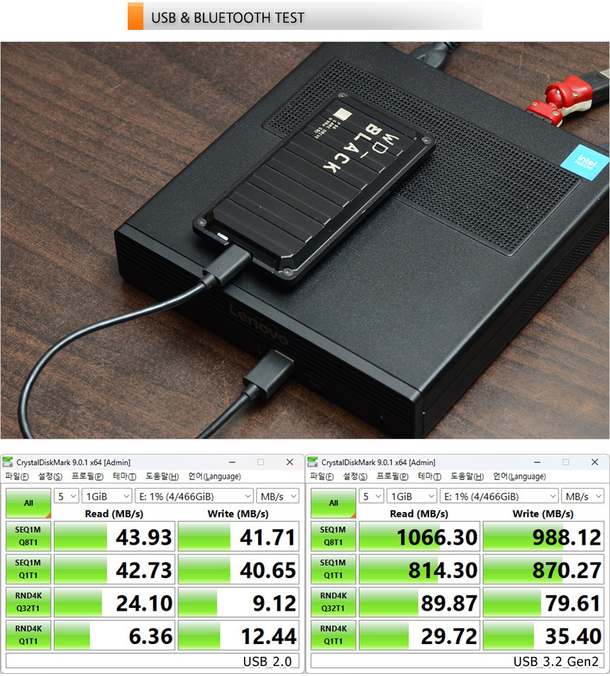 USB 3.2 Gen2 단자를 지원해 빠른 데이터 전송이 가능하다. 상단의 사진은 외장 SSD를 이용해 속도 테스트를 진행하고 있는 모습으로 USB 2.0과 확연히 비교되는 빠른 속도를 보여주었다.