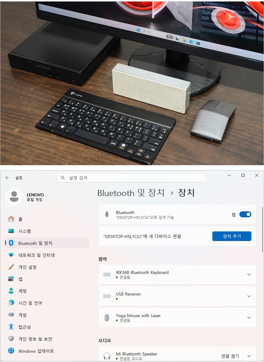 테스트를 위해 PC와 모니터, 키보드 등을 셋팅한 모습으로 거의 공간을 차지하지 않는 것을 확인할 수 있다. 산업현장이나 연구소, 매장등에서 공간의 제약없이 사용할 수 있을 것이다.