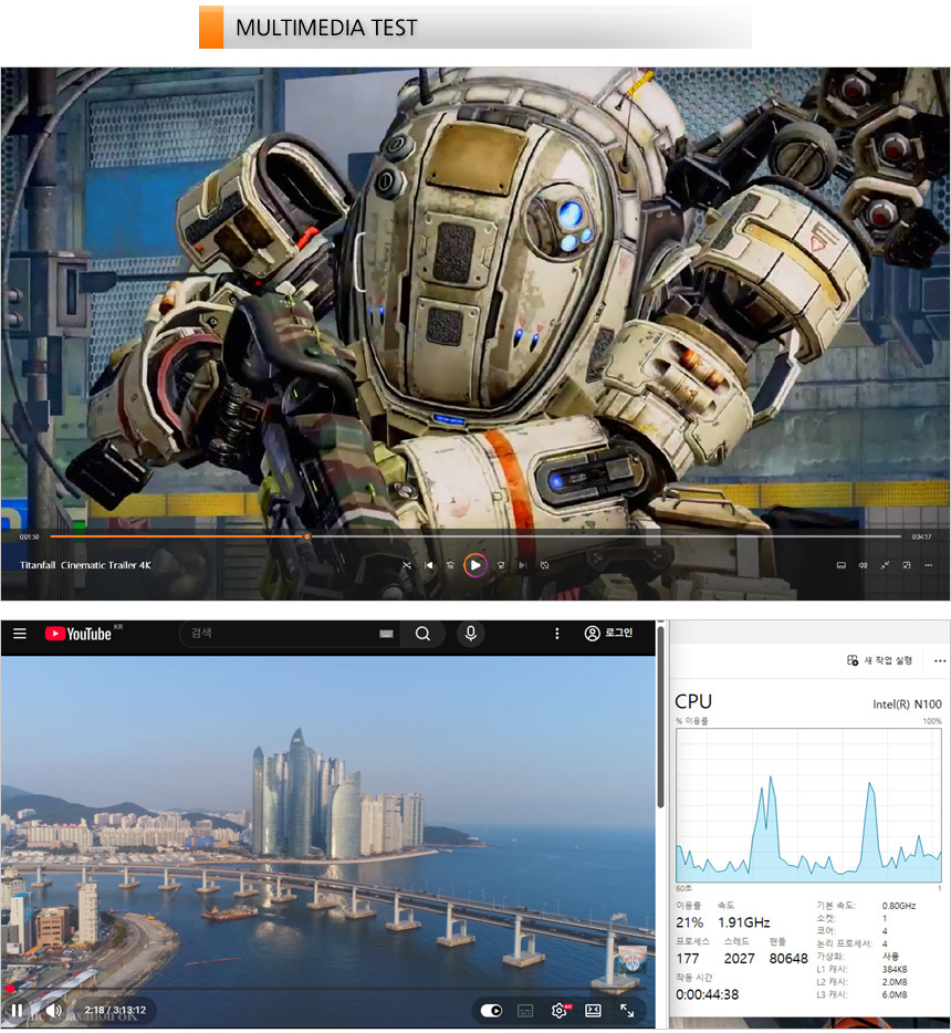 4K 동영상을 이용해 멀티미디어 테스트를 진행하고 있는 모습으로 부드럽게 재생되는 것을 확인할 수 있었다. (단, 멀티테스킹은 불가하다.) 또한 유튜브 고화질 동영상을 이용해 CPU 점유율을 테스트 해 보았는데 (2160P@60FPS) 15~70% 대의 점유율을 보여 주었다.