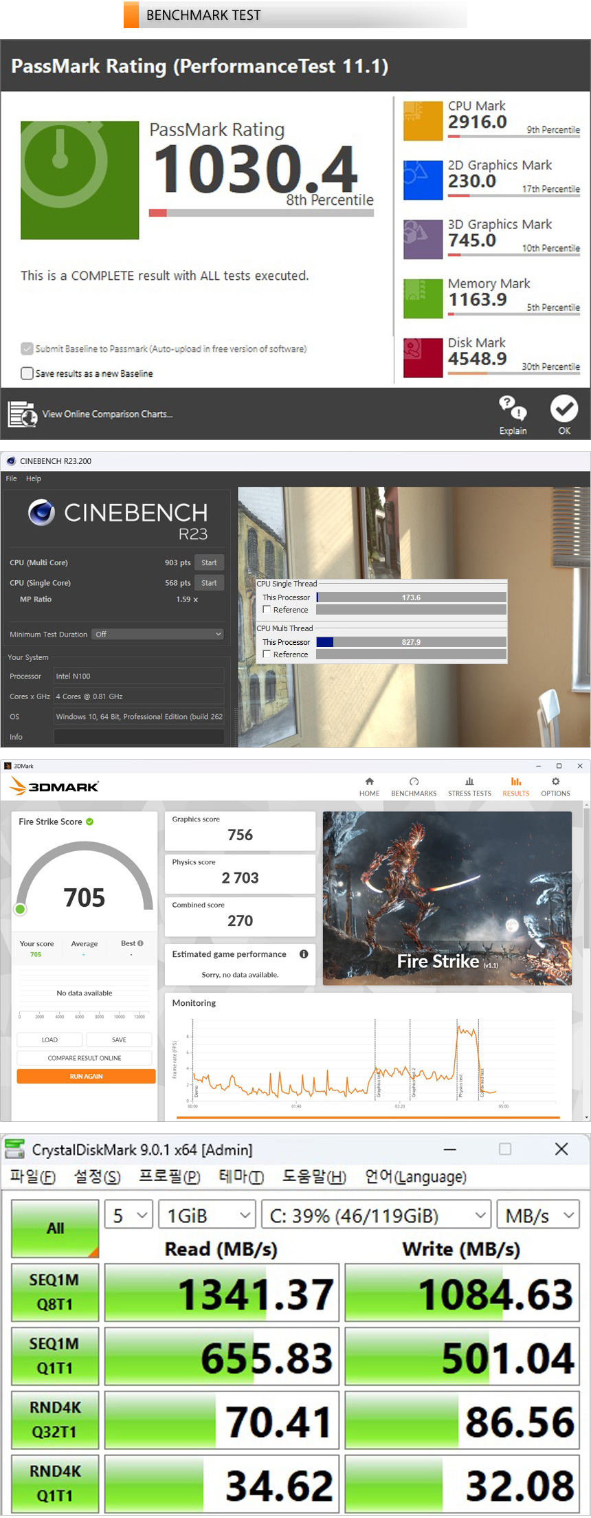 벤치마크 프로그램을 이용해 성능을 확인하고 있는 모습으로 고성능 PC나 노트북과는 상당한 차이가 있는 것을 확인할 수 있다. (캐주얼한 작업에 특화된 모델이라는 것을 다시 말씀드린다.)