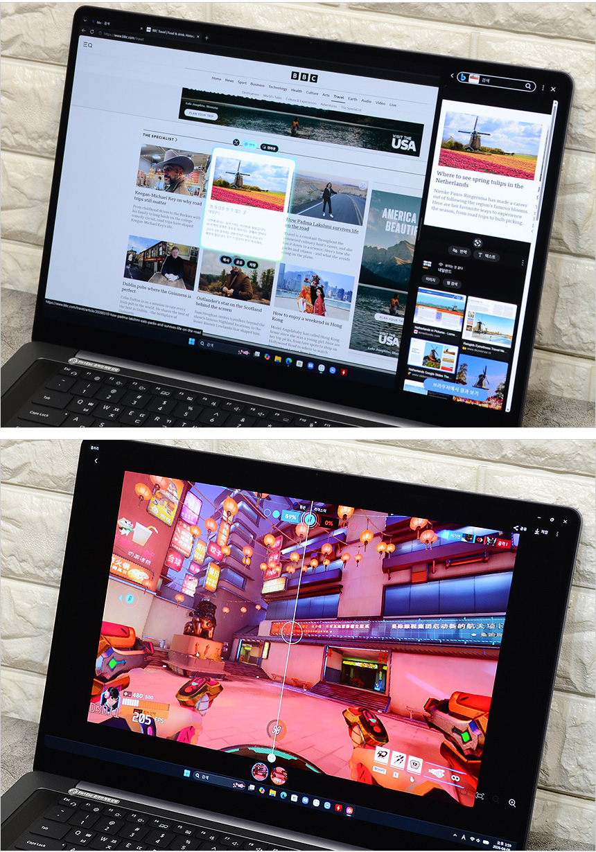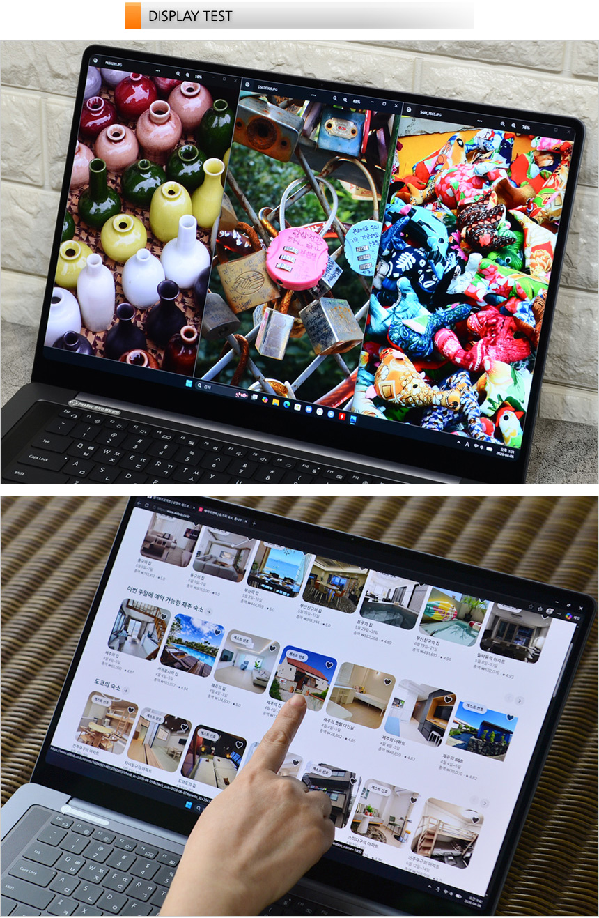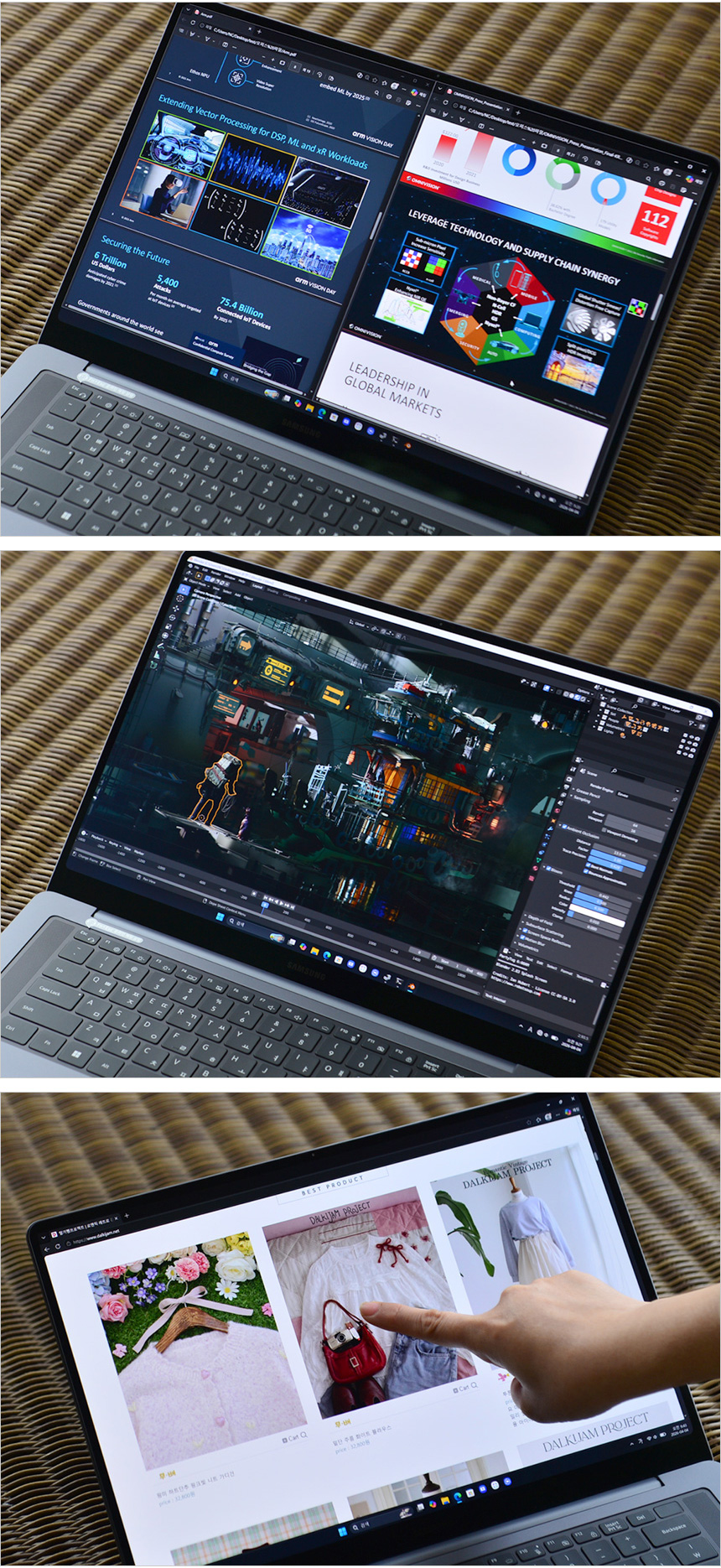 뛰어난 화질도 장점이라 할 수 있다. 16형 대화면의 고해상도 Dynamic AMOLED 2X 디스플레이를 탑재해 진한 색감을 즐길 수 있었으며 120Hz 주사율을 지원하고 블루라이트 감소 기술, 저반사 패널도 적용되어 장시간 사용시에도 눈이 상당히 편했다. 뿐만 아니라 터치를 지원해 편하게 노트북을 조작할 수 있었으며 HDR 1000nits로 밝기가 높아져 더 사실감 넘치는 영상을 즐길 수 있었다.