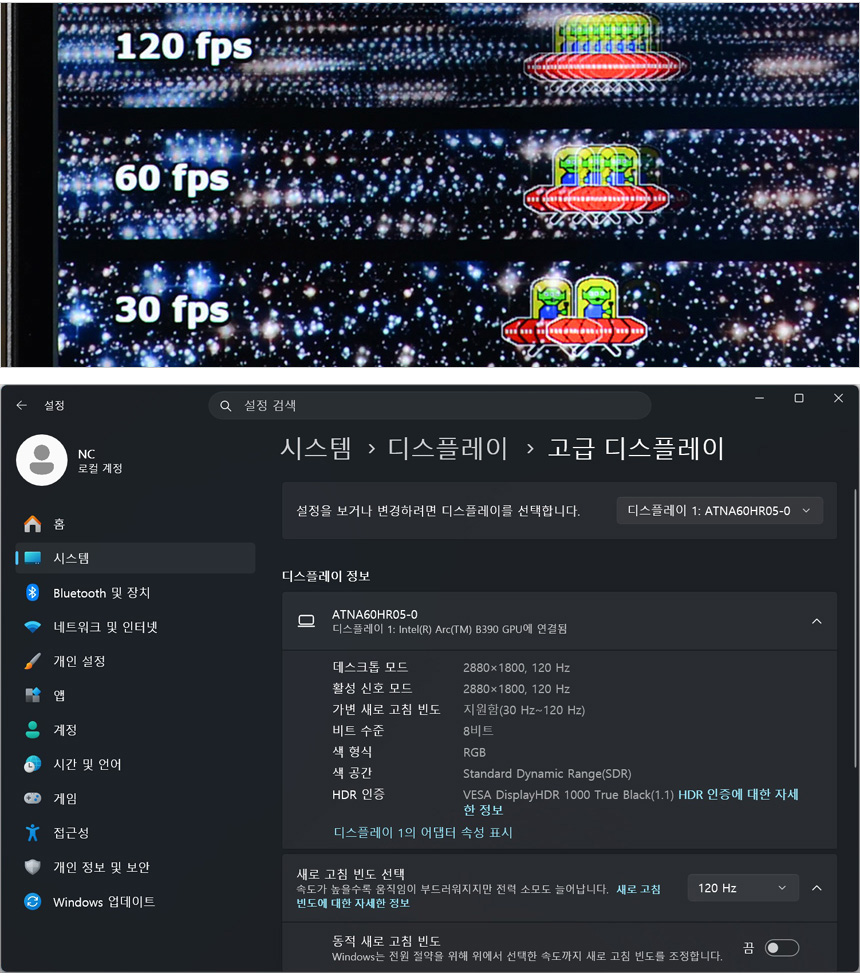 120Hz 주사율 지원으로 물 흐르듯 부드러운 영상을 즐길 수 있다. 특히 영상에 맞게 주사율을 조정하는 가변주사율을 적용해 불필요한 배터리 소모를 최소화 할 수 있다. (가변 주사율이 30Hz 까지 낮아진 것이 눈에띈다. 정적인 화면에서 더 배터리를 절약하기 위한 셋팅이다.) 상단의 사진은 하위 프레임과 같이 재생되는 영상 (960 Pixel Per Sec) 을 셔터스피드 1/20 로 촬영한 모습으로 프레임이 낮을수록 캐릭터의 수가 적으며 프레임이 높아질수록 시간당 많은 화면이 뿌려지기 때문에 캐릭터의 수가 많은 것을 확인할 수 있다.