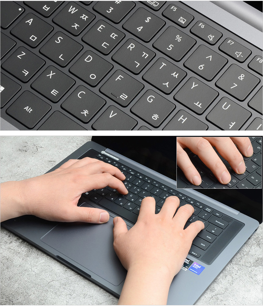 키보드의 모습으로 16형 대화면을 지원함에도 텐키리스 방식이 적용된 것을 확인할 수 있다. NUM 키패드가 없어 숫자입력이 많은 엑셀등을 사용할 때 약간의 불편이 있긴 하지만 정중앙에 키보드가 위치해 (텐키방식은 좌측으로 쏠린다.) 더 편하게 안정적인 타이핑이 가능하다. 또한 LED 백라이트가 설치되어 야간에도 불편없이 사용할 수 있다. (단축키를 통해 ON/OFF와 밝기 조절이 가능하다.)