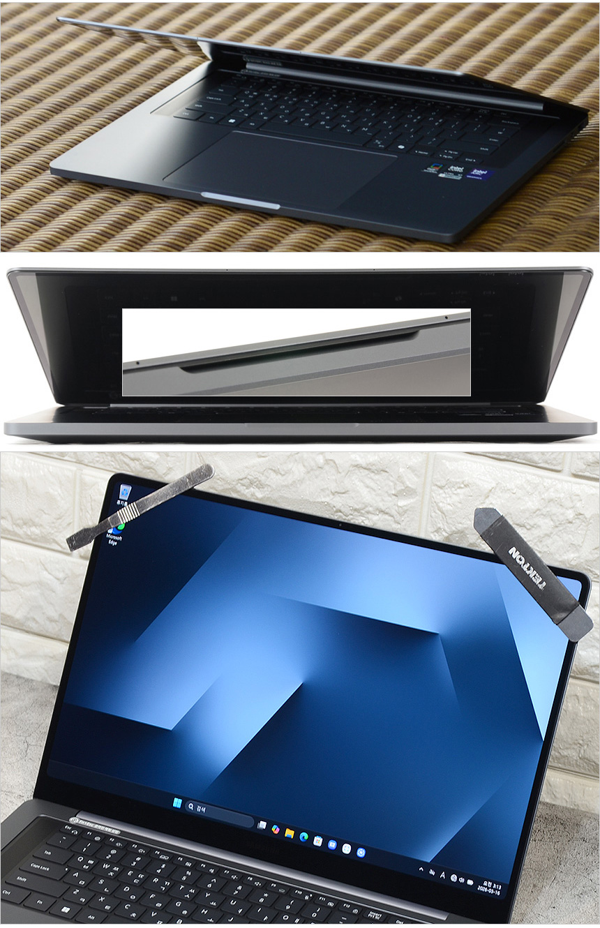 다이나믹 AMOLED 2X 디스플레이를 탑재한 노트북으로 시야각 없는 선명한 영상을 즐길 수 있다. 상단의 사진은 시야각 테스트를 진행하고 있는 모습으로 극단적인 각도에서도 시야각으로 인한 불편은 느껴지지 않았다.