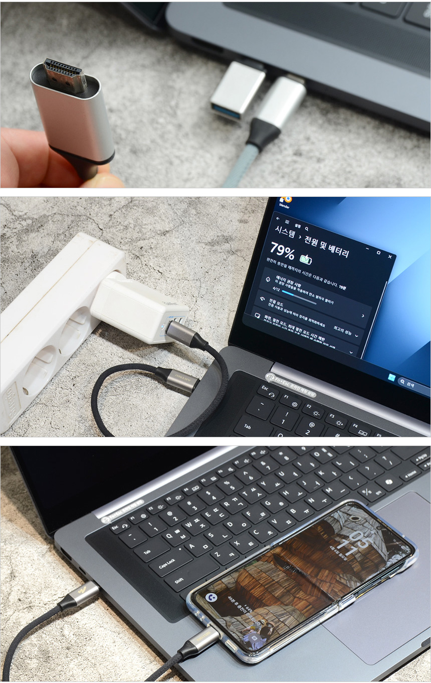 빠른 데이터 전송이 가능한 썬더볼트 4 단자는 상시전원 지원으로 노트북이 꺼진 상태에서도 스마트폰 충전용으로 사용할 수 있다. 또한 젠더를 사용하면 A 타입의 일반 주변기기 사용이 가능하고 디스플레이 출력을 지원해 모니터를 연결할 수 있다. 뿐만 아니라 PD충전을 지원해 기본 충전기 뿐만 아니라 PD 충전기를 사용해 전원을 공급할 수 있다. (65W PD충전기도 사용 가능한 것을 확인할 수 있었다.)