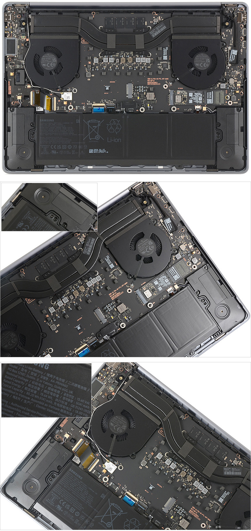 노트북 내부의 모습으로 상단에 듀얼팬과 방열판 등이 설치된 것을 확인할 수 있으며 (한 개의 히트파이프가 장착된 갤럭시북 6 프로와 달리 2개의 히트파이프가 장착된 것이 눈에 띄며 기판의 크기도 크다) 하단에는 80.20Wh (5141mAh) 리튬이온 배터리가 설치되어 있고 마그네틱과 스피커가 장착된 것도 알 수 있다.