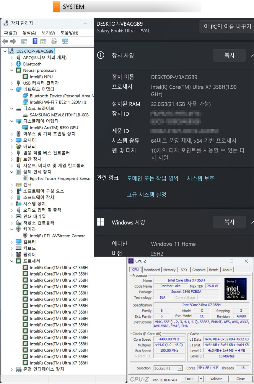 시스템 정보를 확인하고 있는 모습으로 4P+8E+4LP 코어에 24MB+18MB 캐시를 지원하는 인텔코어 울트라 X7 358H 프로세서가 탑재된 것을 확인할 수 있다. 인텔 18A 공정으로 설계된 팬서레이크중 상급 프로세서로 기존 모바일 프로세서와는 확연히 비교되는 강력한 성능을 경험할 수 있다.