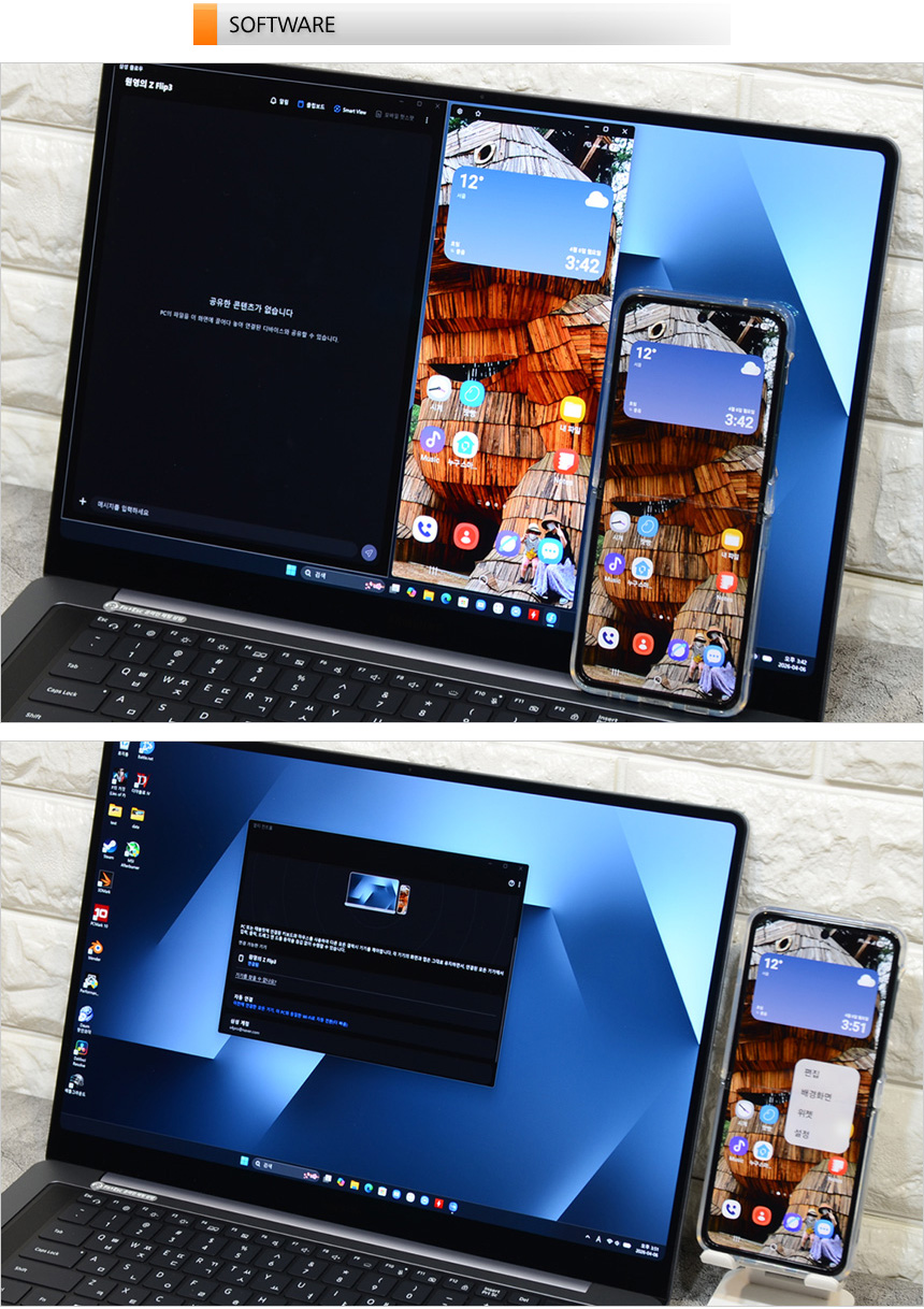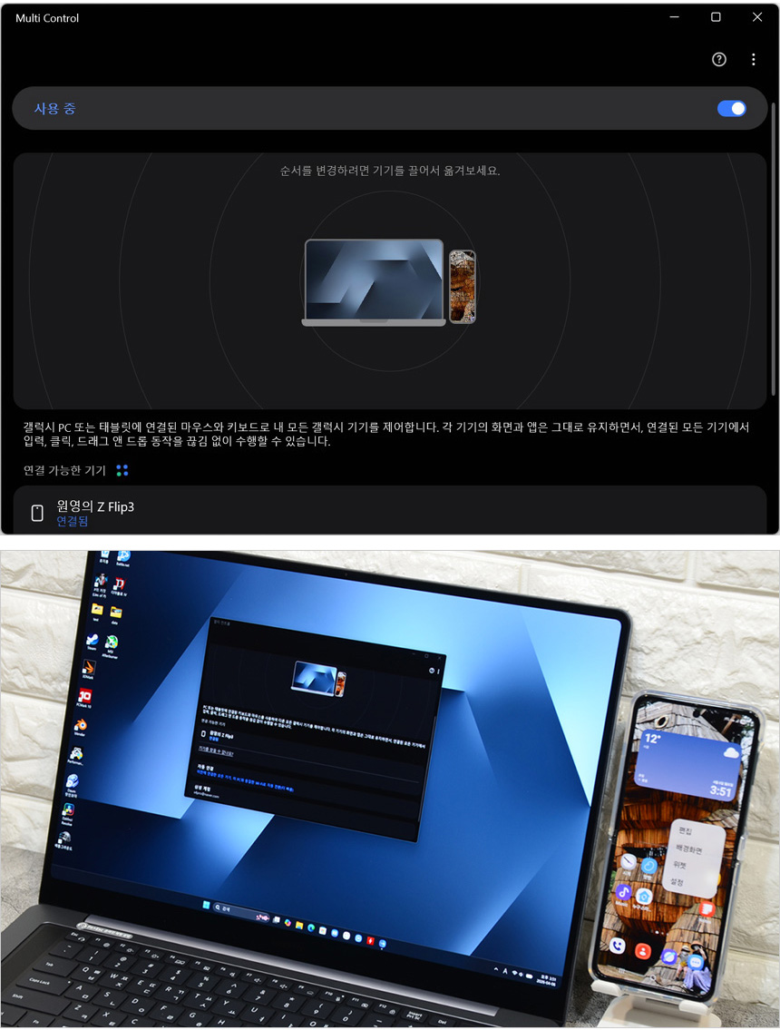 키보드와 마우스를 스마트폰에서도 사용할 수 있는 멀티 컨트롤 기능을 제공한다. 상단의 사진은 멀티 컨트롤을 테스트 하고 있는 모습으로 듀얼 모니터를 사용한 듯 자연스럽게 마우스 커서가 이동하는 것을 확인할 수 있었다. (KVM 과 달리 디바이스 변경을 위한 단축키도 누를 필요가 없다.) 텍스트 등을 복사에 기기간 붙여넣기도 할 수 있어 유용하게 활용할 수 있을 것이다. @ 동영상을 확인하기 바란다.