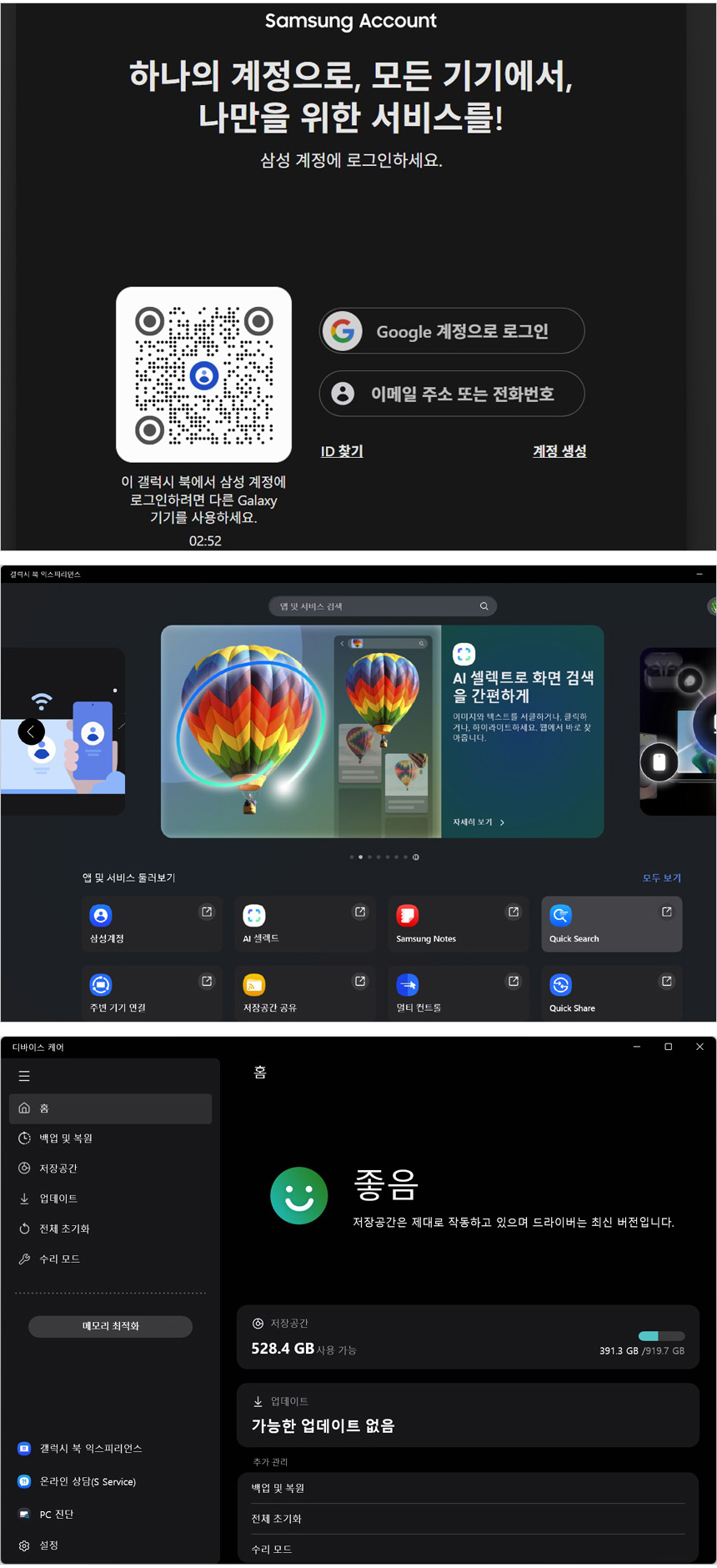 기존 갤럭시북 시리즈에서 지원하던 S/W 는 대부분 지원하는 것을 확인할 수 있었다. 삼성 어카운트에서 QR코드 로그인을 제공해 삼성계정이 필요한 앱을 편하게 실행할 수 있으며 갤럭시북 익스피리언스를 실행하면 설치된 앱을 손쉽게 실행할 수 있다. 또한 디바이스 케어를 실행하면 업데이터가 가능해 최상의 컨디션으로 노트북을 사용할 수 있다. (노트북 출시 초기이기 때문에 드라이버나 바이오스가 빈번하게 업데이트 될 것이다. 자주 디바이스 케어를 실행하기 바란다.)
