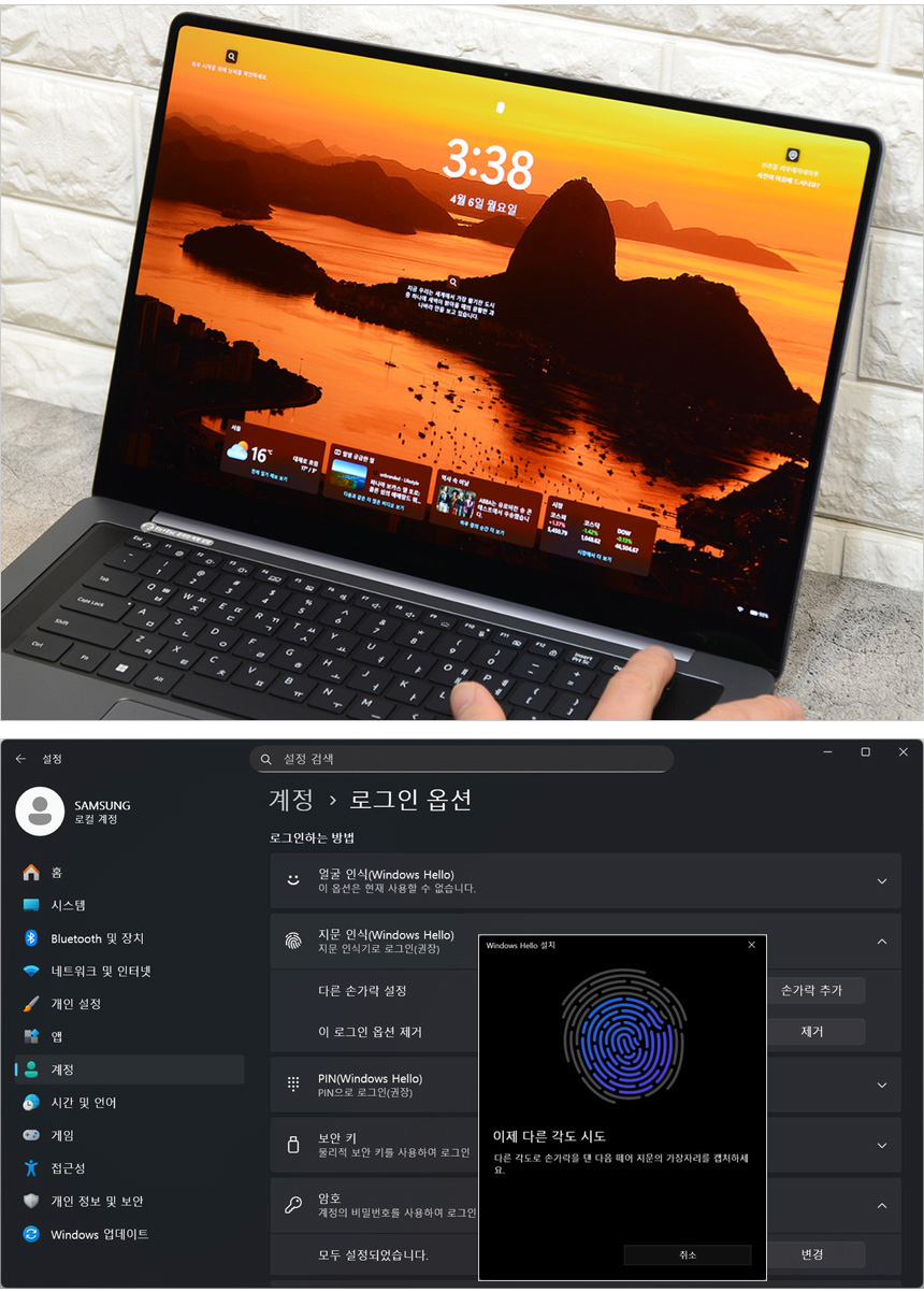 전원 버튼에 지문인식 센서를 탑재해 높은 보안성과 편의성을 경험할 수 있다. 특히 삼성 녹스 보안 솔루션 까지 추가된 노트북으로 높은 보안이 필수적인 비즈니스 노트북으로도 손색이 없다.